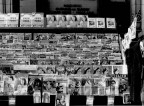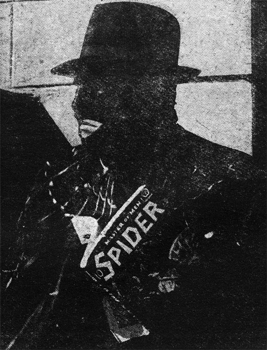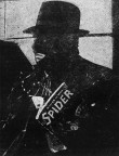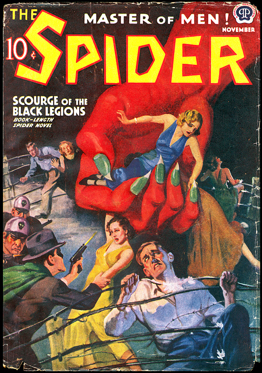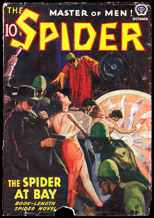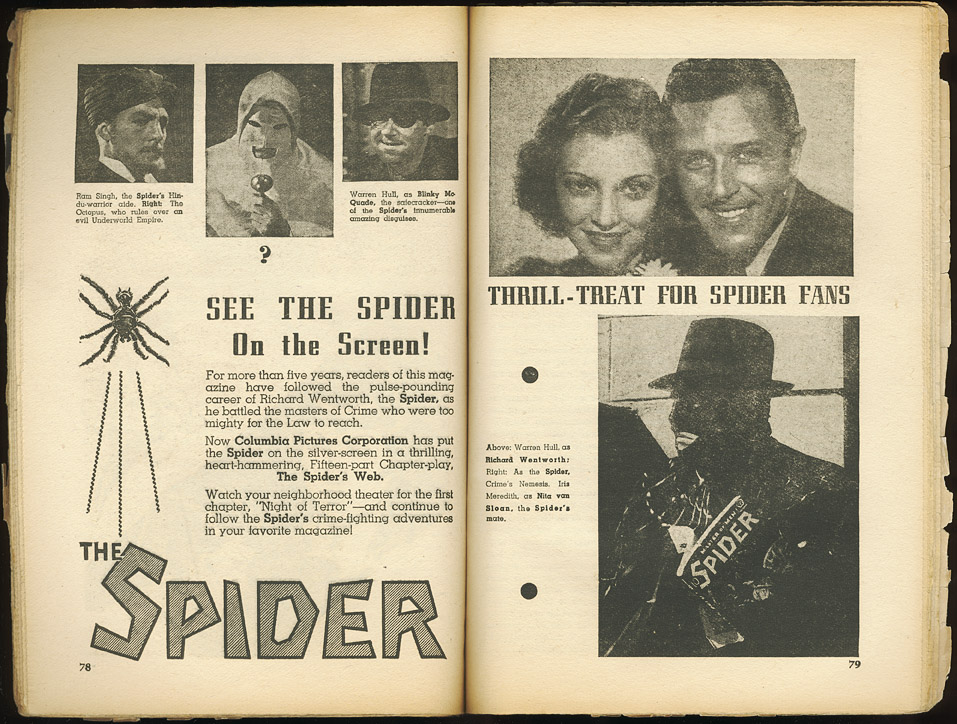 The October 1938 issue, “The Spider at Bay,” was on stands while the first Spider serial, The Spider’s Web, was being filmed, so it turns up in Web photography and promotional material, which we are also including here. The last picture is a random archival photo of a newsstand — that just happens to have the 11/38 issue of The Spider in the middle of the racks.
