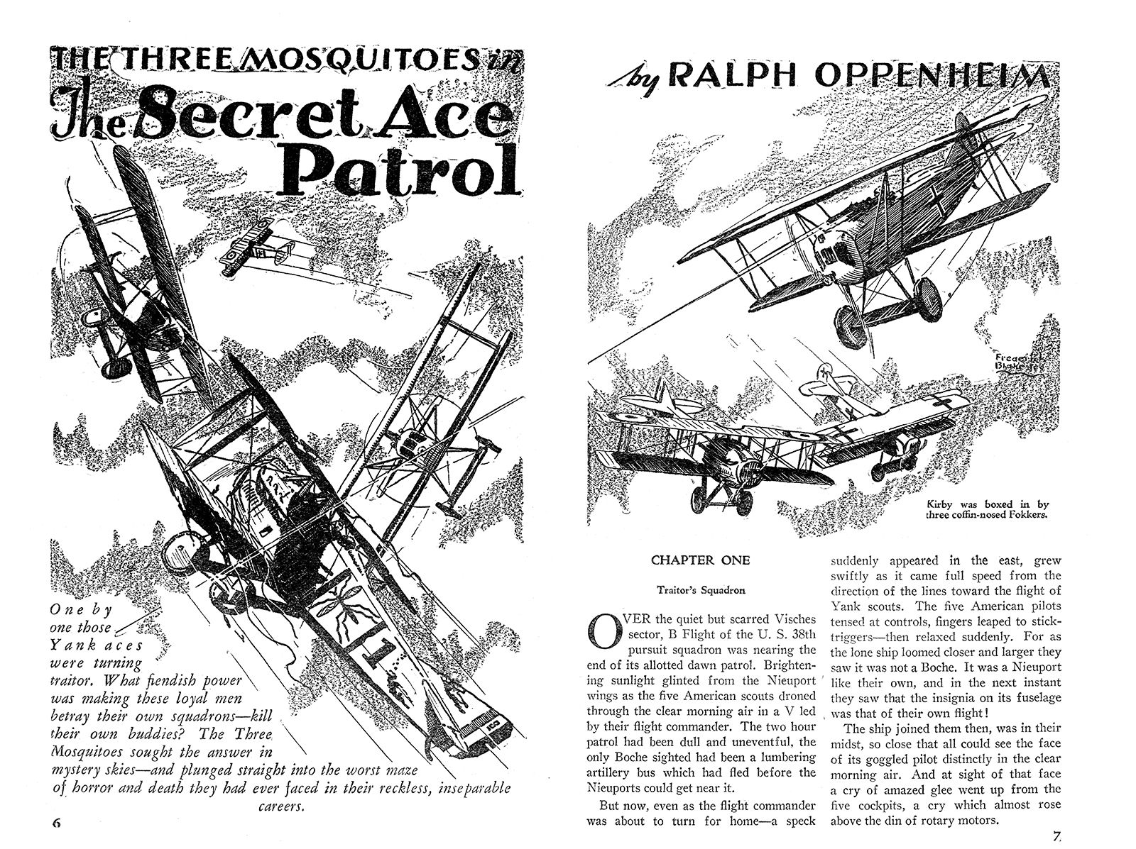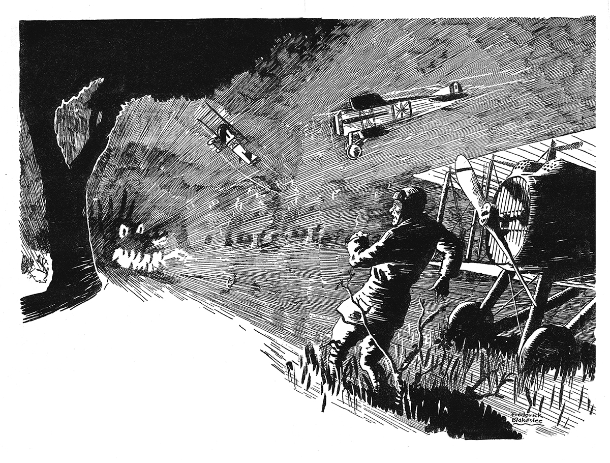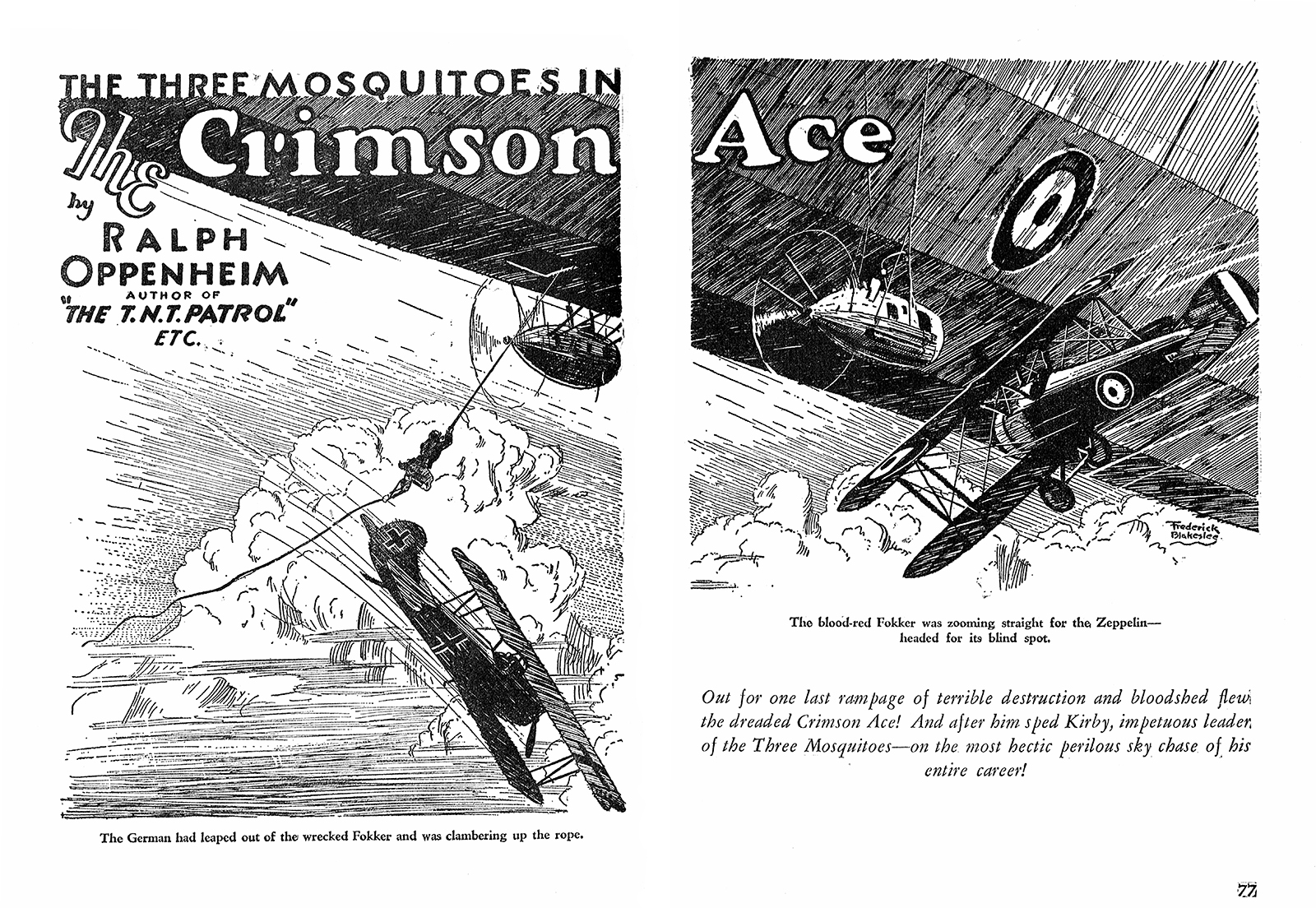 While all of the Age of Aces aviation titles feature the original artwork for each story, it has been modified to better fit our book designs. In general, the original artwork flowed around the opening of the adventure, but in our volumes it’s expanded to fill an entire page or spread to serve as a “cover†to the story. Also, to unify the book we run the story’s title in our own font, stripping out the lettering done by the artist. Here on the web though we can offer a “dvd extra†of sorts — the full, unmodified artwork as it originally appeared in the pulp.