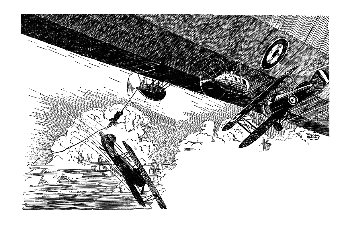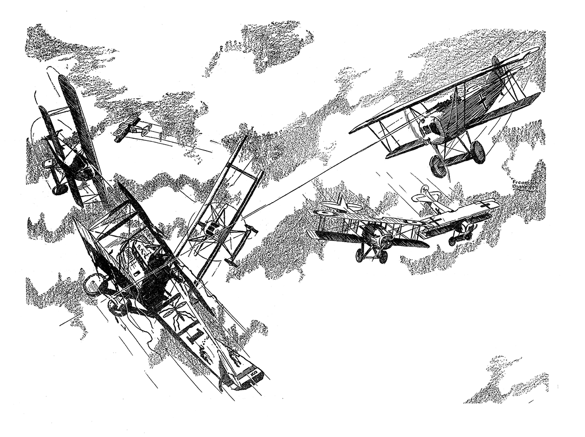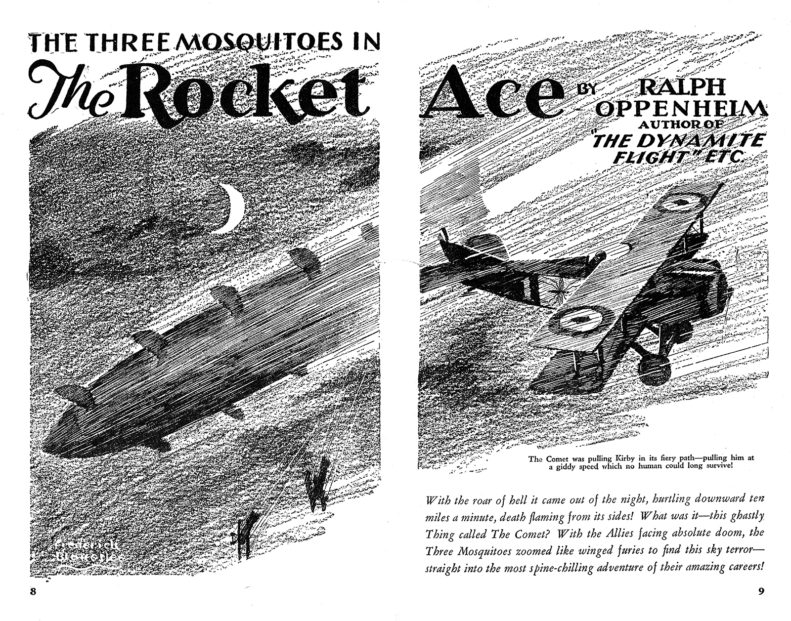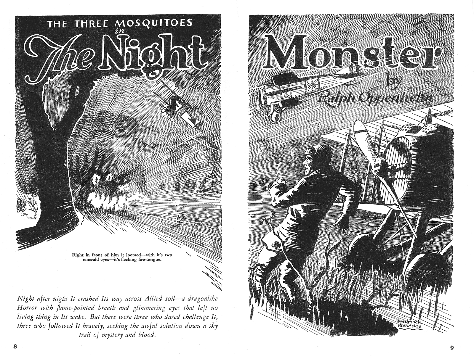 While all of the Age of Aces aviation titles feature the original artwork for each story, it has been modified to better fit our book designs. In general, the original artwork flowed around the opening of the adventure, but in our volumes it’s expanded to fill an entire page or spread to serve as a “cover†to the story. Also, to unify the book we run the story’s title in our own font, stripping out the lettering done by the artist. Here on the web though we can offer a “dvd extra†of sorts — the full, unmodified artwork as it originally appeared in the pulp.