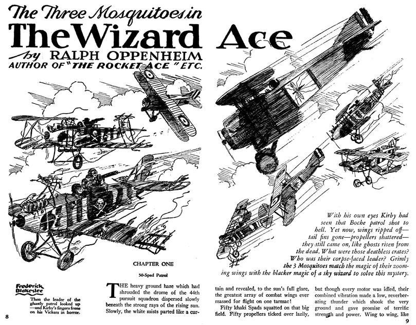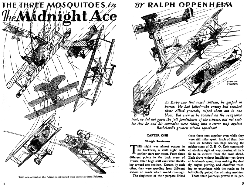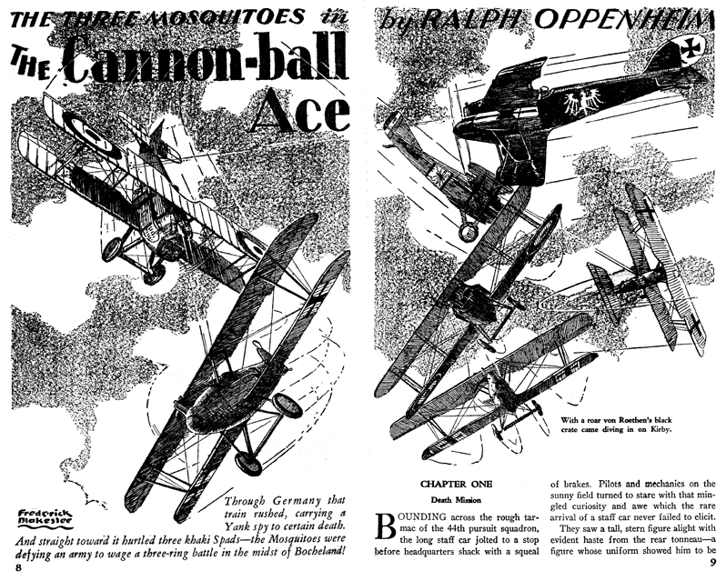 While all of the Age of Aces aviation titles feature the original artwork for each story, it has been modified to better fit our book designs. In general, the original artwork flowed around the opening of the adventure, but in our volumes it’s expanded to fill an entire page or spread to serve as a “cover†to the story. Also, to unify the book we run the story’s title in our own font, stripping out the lettering done by the artist. Here on the web though we can offer a “dvd extra†of sorts — the full, unmodified artwork as it originally appeared in the pulp.