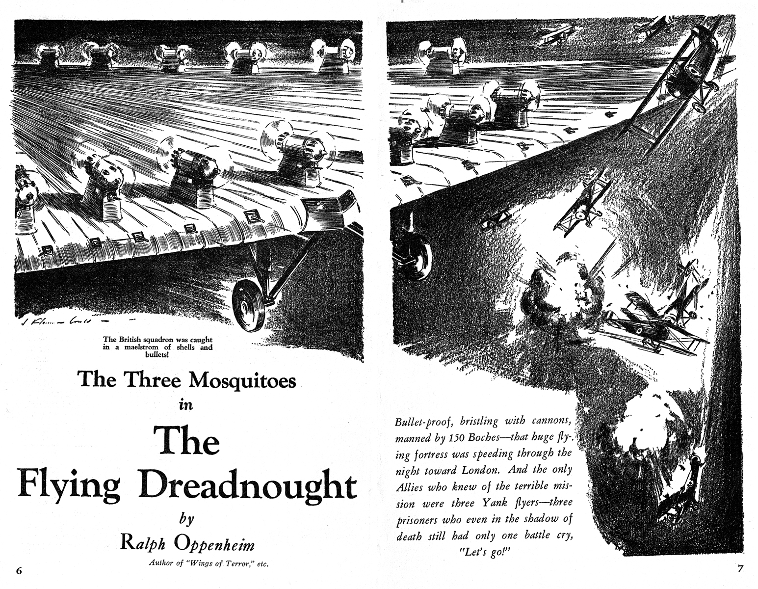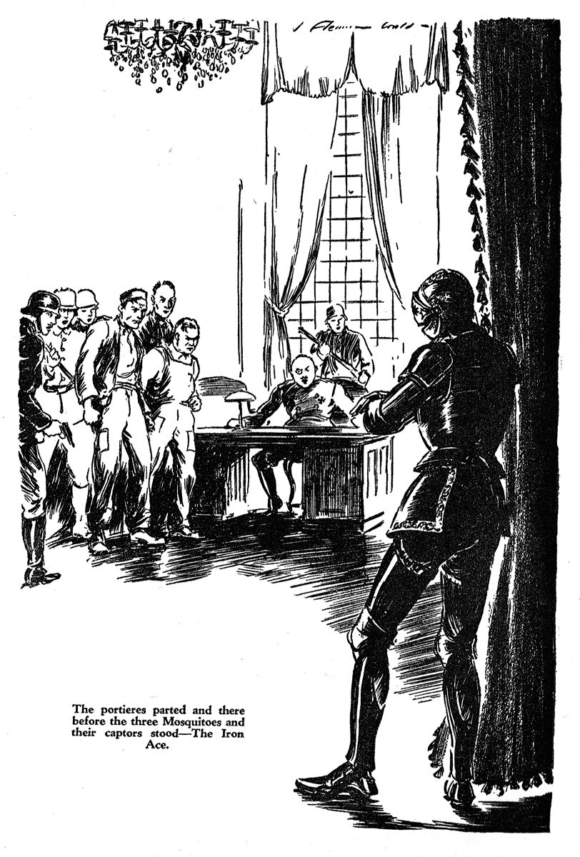 While all of the Age of Aces aviation titles feature the original artwork for each story, it has been modified to better fit our book designs. In general, the original artwork flowed around the opening of the adventure, but in our volumes it’s expanded to fill an entire page or spread to serve as a “cover†to the story. Also, to unify the book we run the story’s title in our own font, stripping out the lettering done by the artist. Here on the web though we can offer a “dvd extra†of sorts — the full, unmodified artwork as it originally appeared in the pulp.