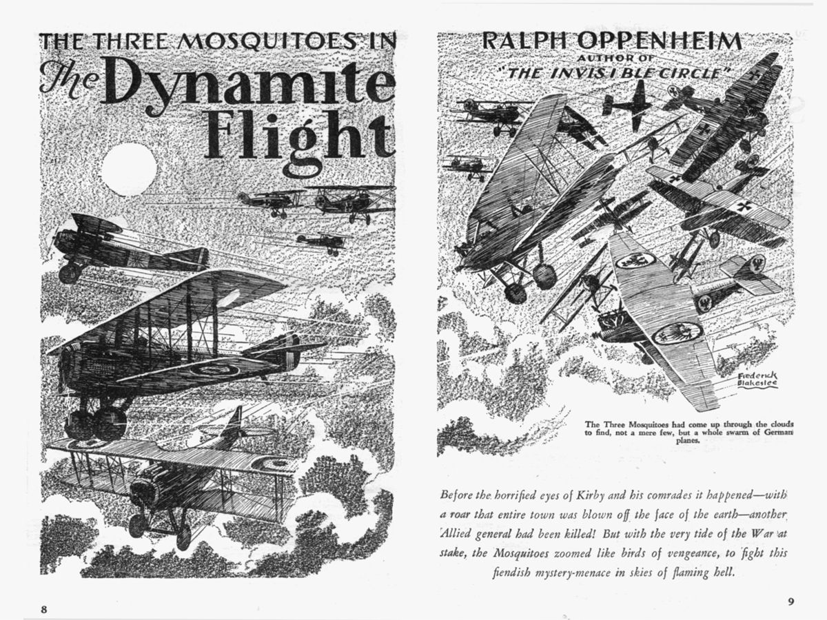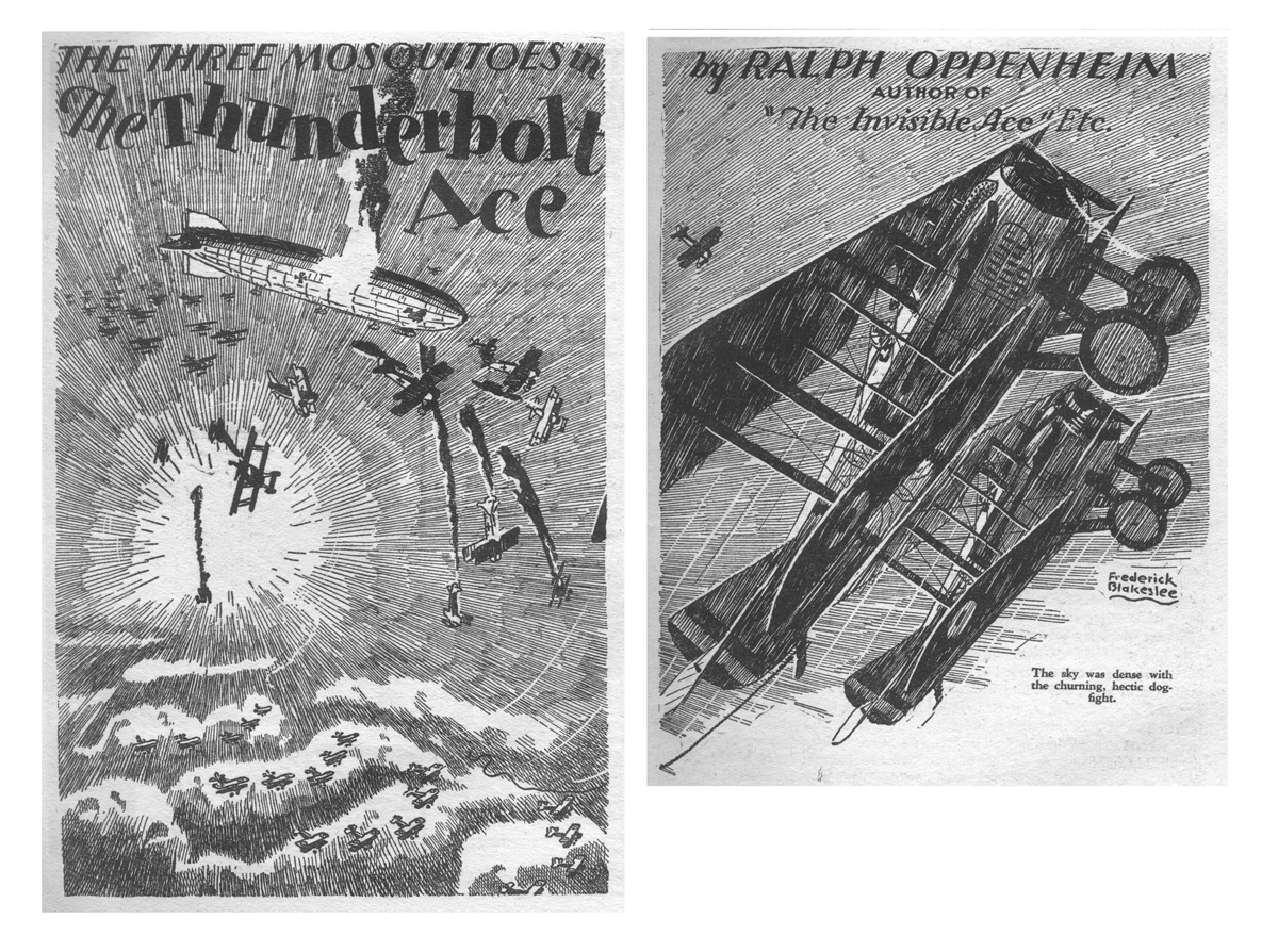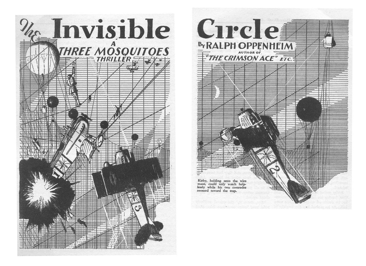 While all of the Age of Aces aviation titles feature the original artwork for each story, it has been modified to better fit our book designs. In general, the original artwork flowed around the opening of the adventure, but in our volumes it’s expanded to fill an entire page or spread to serve as a “cover†to the story. Also, to unify the book we run the story’s title in our own font, stripping out the lettering done by the artist. Here on the web though we can offer a “dvd extra†of sorts — the full, unmodified artwork as it originally appeared in the pulp.