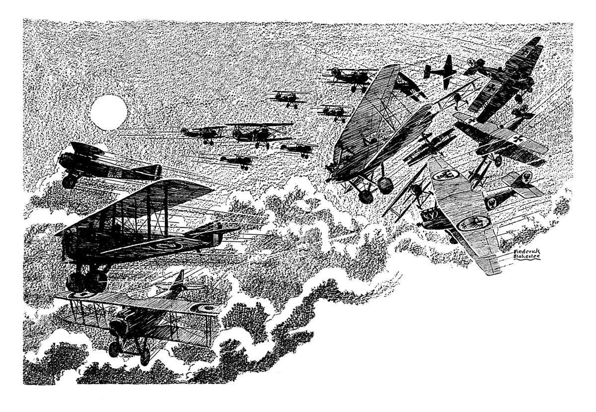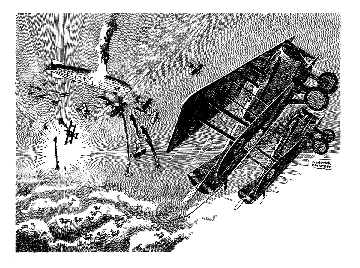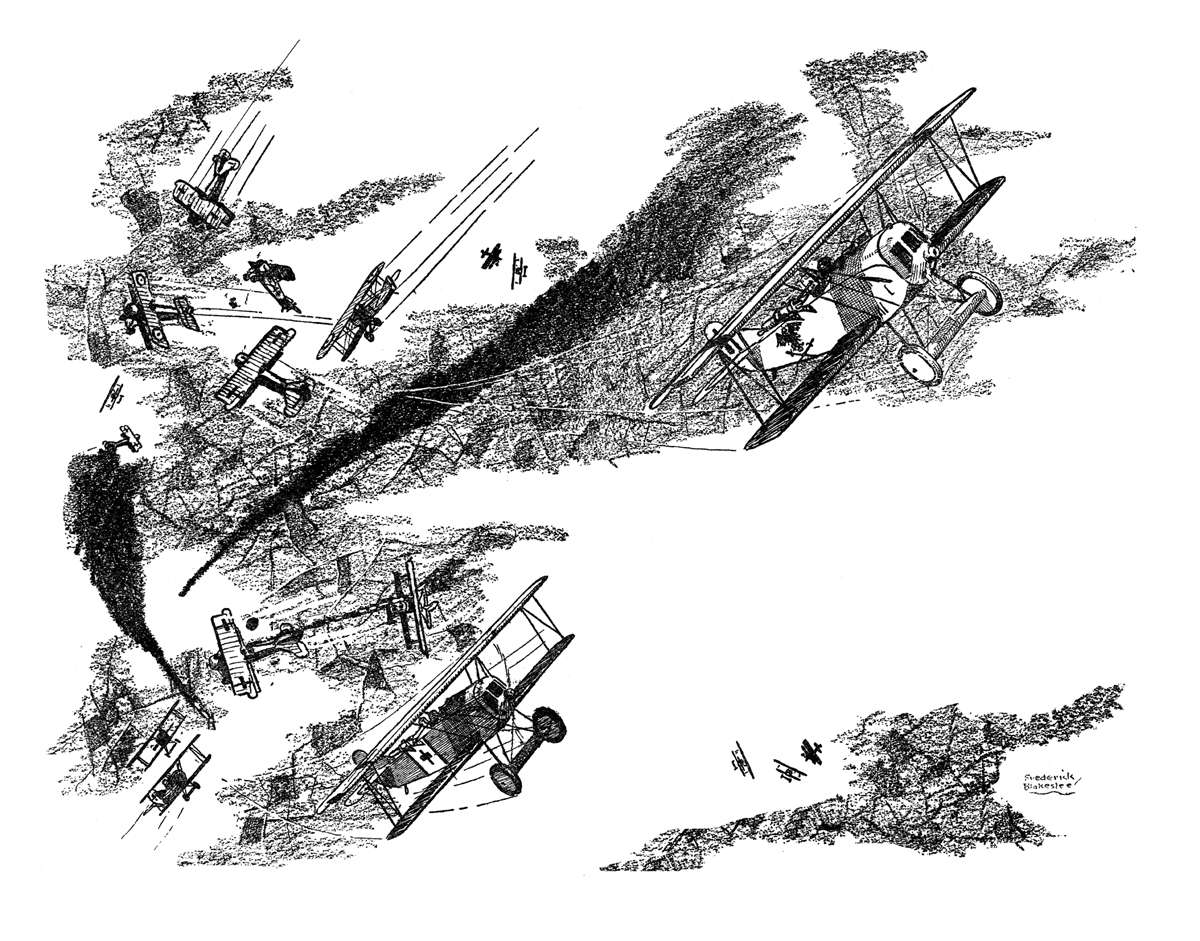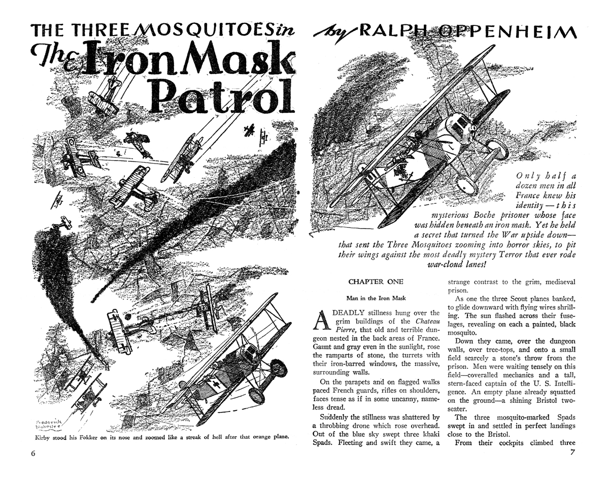 While all of the Age of Aces aviation titles feature the original artwork for each story, it has been modified to better fit our book designs. In general, the original artwork flowed around the opening of the adventure, but in our volumes it’s expanded to fill an entire page or spread to serve as a “cover†to the story. Also, to unify the book we run the story’s title in our own font, stripping out the lettering done by the artist. Here on the web though we can offer a “dvd extra†of sorts — the full, unmodified artwork as it originally appeared in the pulp.