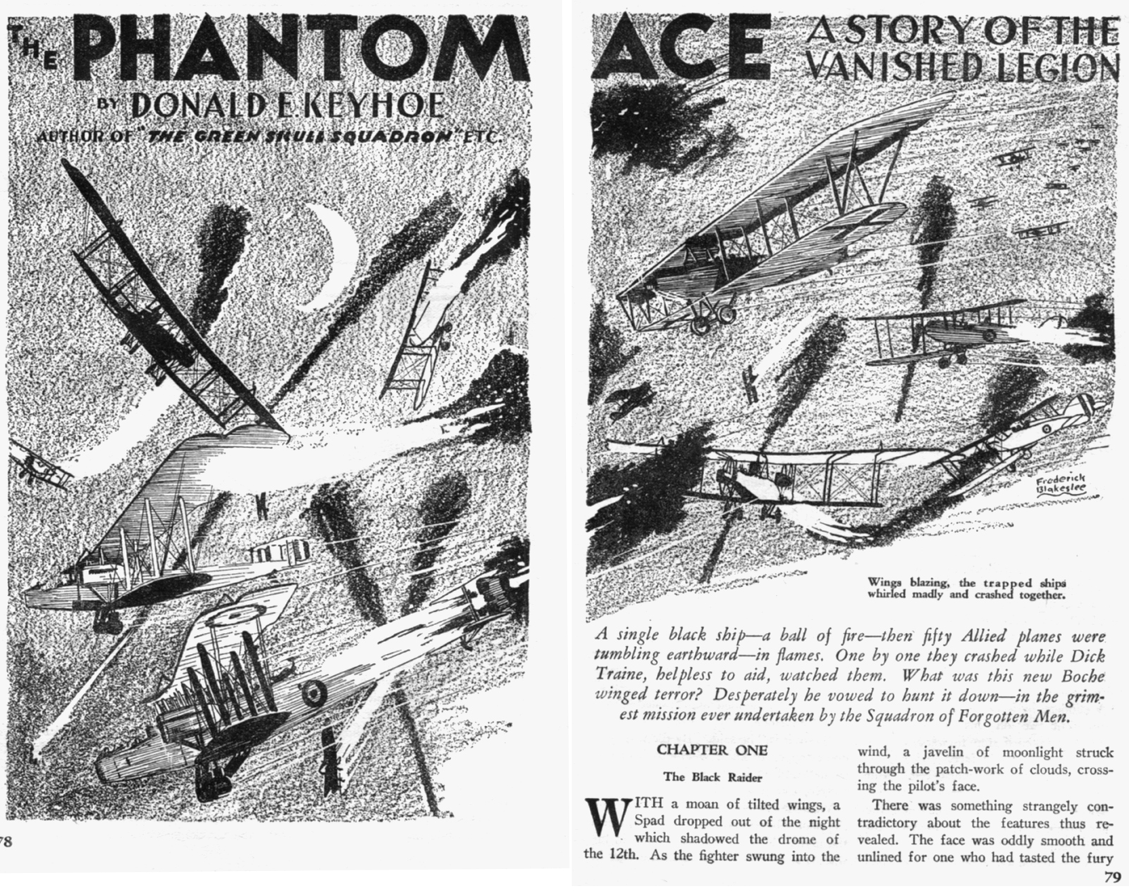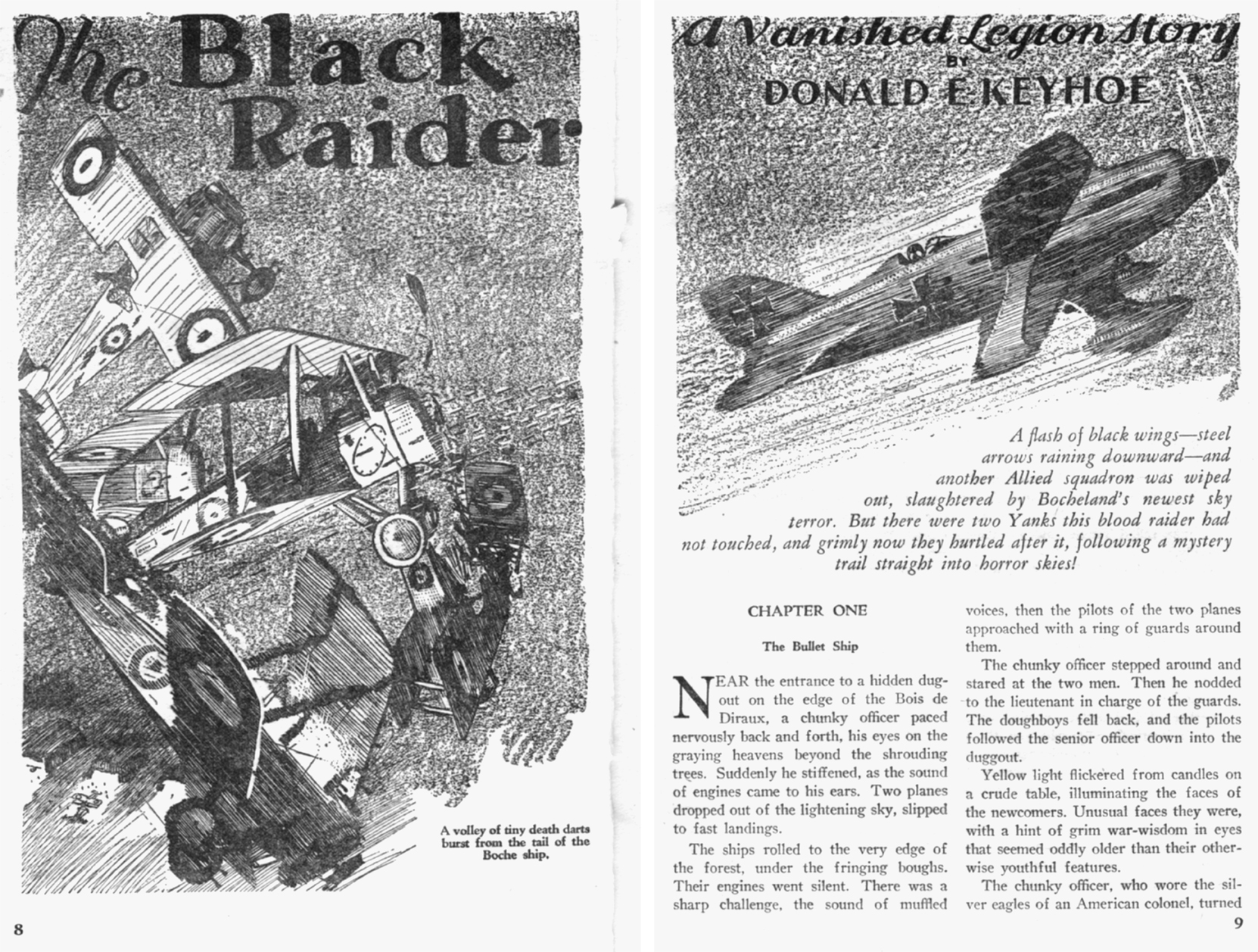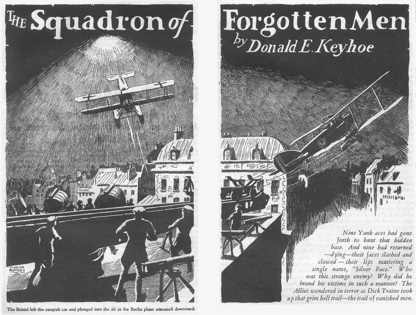 While all of the Age of Aces aviation titles feature the original artwork for each story, it has been modified to better fit our book designs. In general, the original artwork flowed around the opening of the adventure, but in our volumes it’s expanded to fill an entire page or spread to serve as a “cover†to the story. Also, to unify the book we run the story’s title in our own font, stripping out the lettering done by the artist. Here on the web though we can offer a “dvd extra†of sorts — the full, unmodified artwork as it originally appeared in the pulp.
