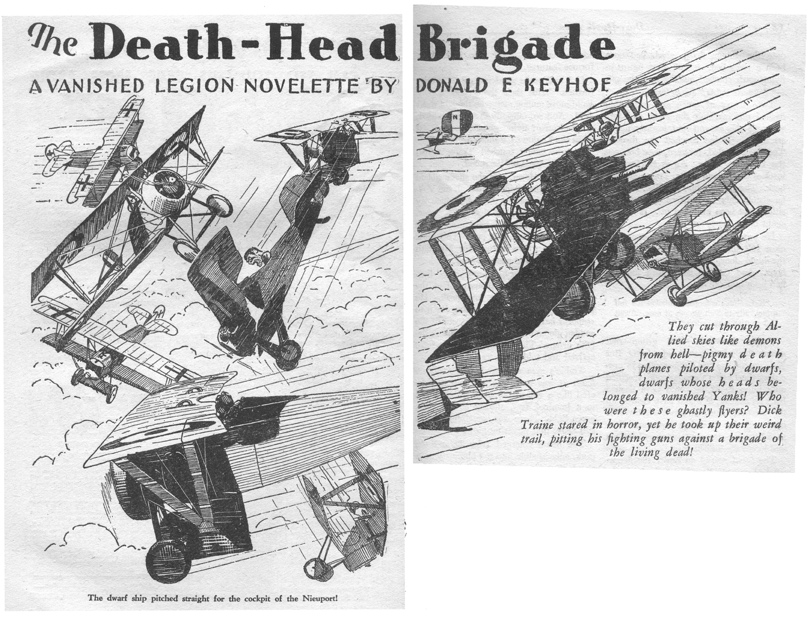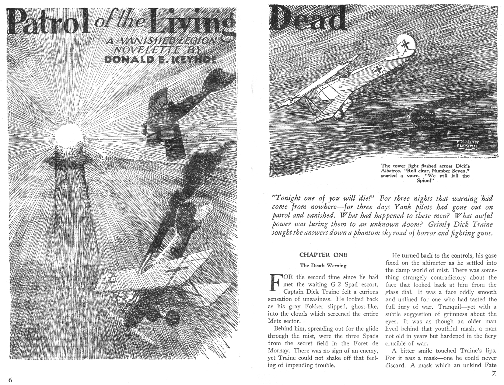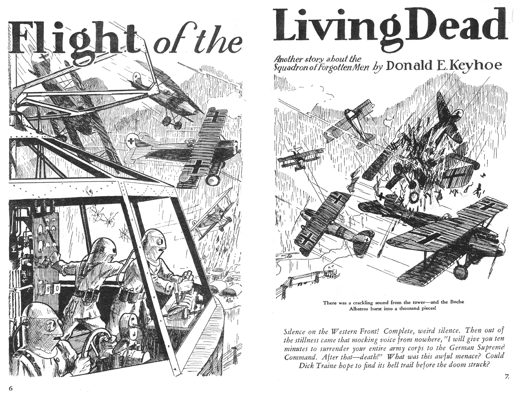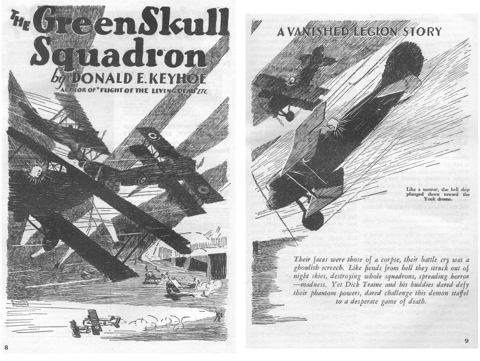 While all of the Age of Aces aviation titles feature the original artwork for each story, it has been modified to better fit our book designs. In general, the original artwork flowed around the opening of the adventure, but in our volumes it’s expanded to fill an entire page or spread to serve as a “cover†to the story. Also, to unify the book we run the story’s title in our own font, stripping out the lettering done by the artist. Here on the web though we can offer a “dvd extra†of sorts — the full, unmodified artwork as it originally appeared in the pulp.