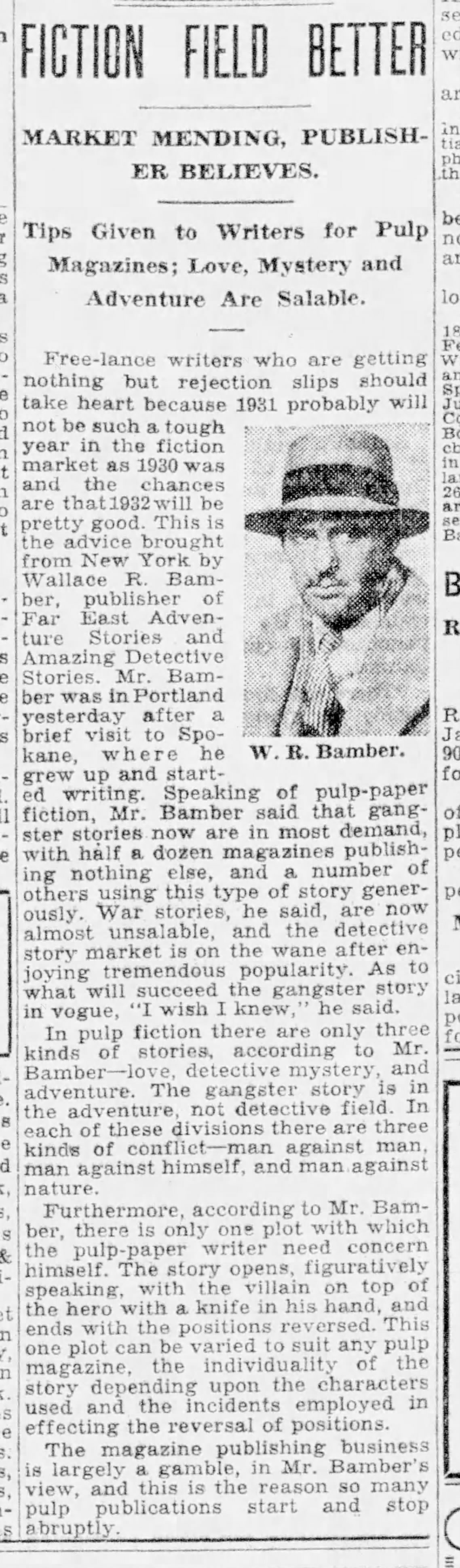 FREE-LANCE writers who are getting nothing but rejection slips should take heart because 1931 probably will not be such a tough year in the fiction market as 1930 was and the chances are that 1932 will be pretty good. This is the advice brought from New York by Wallace R. Bamber, publisher of Far East Adventure Stories and Amazing Detective Stories. Mr. Bamber was in Portland yesterday after a brief visit to Spokane, where he grew up and started writing. Speaking of pulp-paper fiction, Mr. Bamber said that, gangster stories now are in most demand, with half a dozen magazines publishing nothing else, and a number of others using this type of story generously. War stories, he said, are now almost unsalable, and the detective Story market, is on the wane after enjoying tremendous popularity. As to what will succeed the gangster story in vogue, “I wish I knew,” he said.