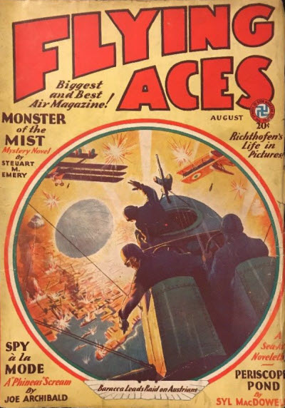 Phineas Pinkham is already grounded and in the doghouse when he almost kills a colonel. Old Man Garrity’s had his fill, so when von Bessinger sends a challenge to the Ninth Pursuit’s thorn in their side, Garrity lets Phineas goto challenge the Von under on condition—he doesn’t come back! It’s Joe Archibald’s “Spy a’la Mode” from the August 1932Flying Aces.