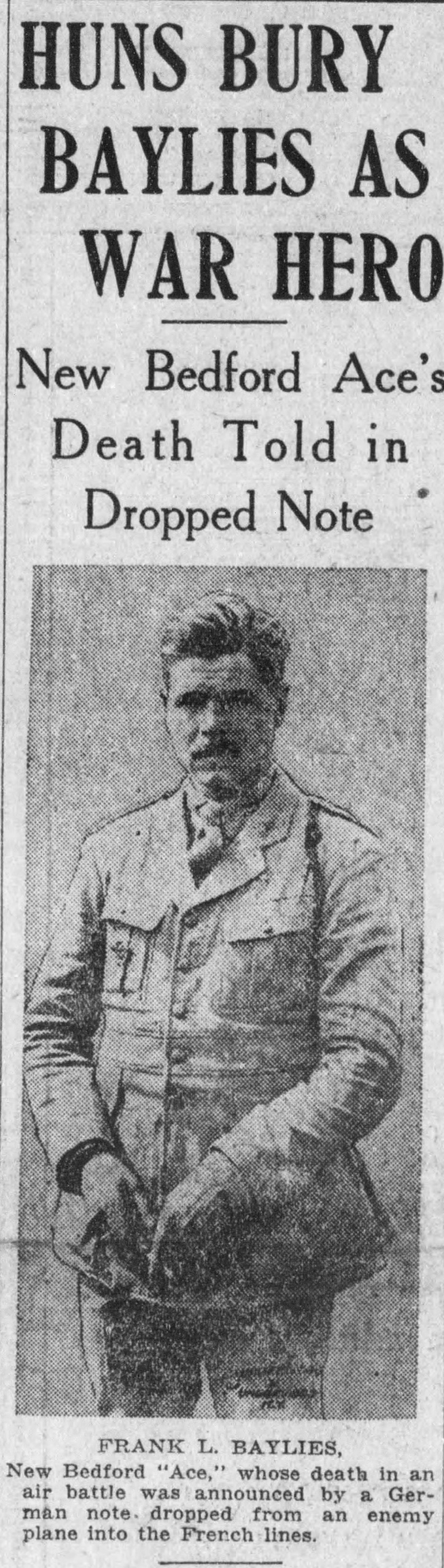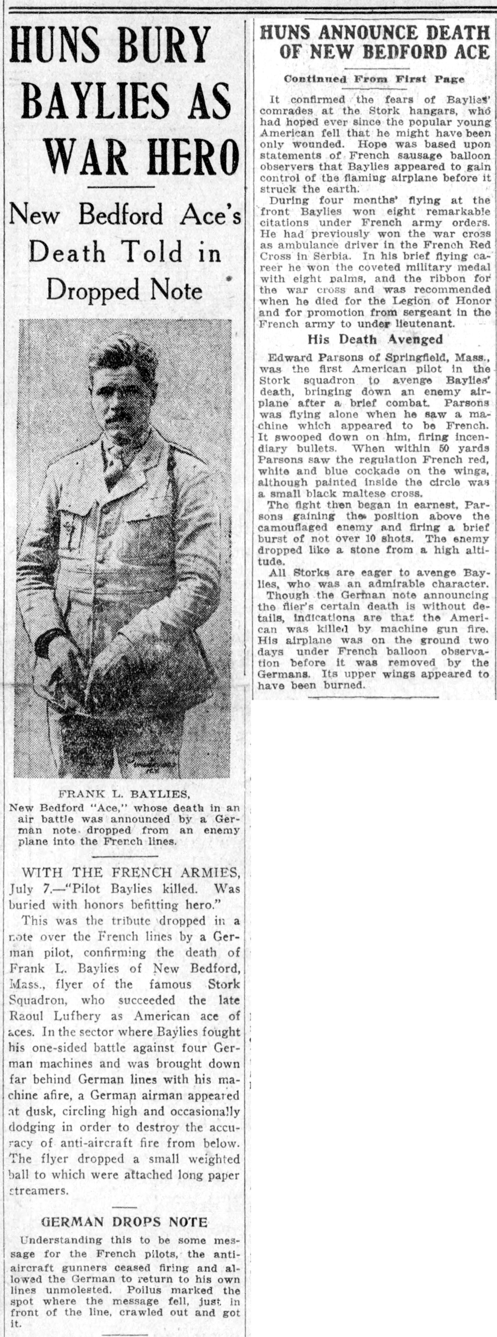 He was killed in action when his patrol encountered the Fokker Triplanes of Jasta 19. He was shot and his Spad wet down in flames five miles behind the German lines. The Germans buried Baylies with full military honours befiting a war hero at Rollet. In 1927 his body was exhumed and reburied in Paris.