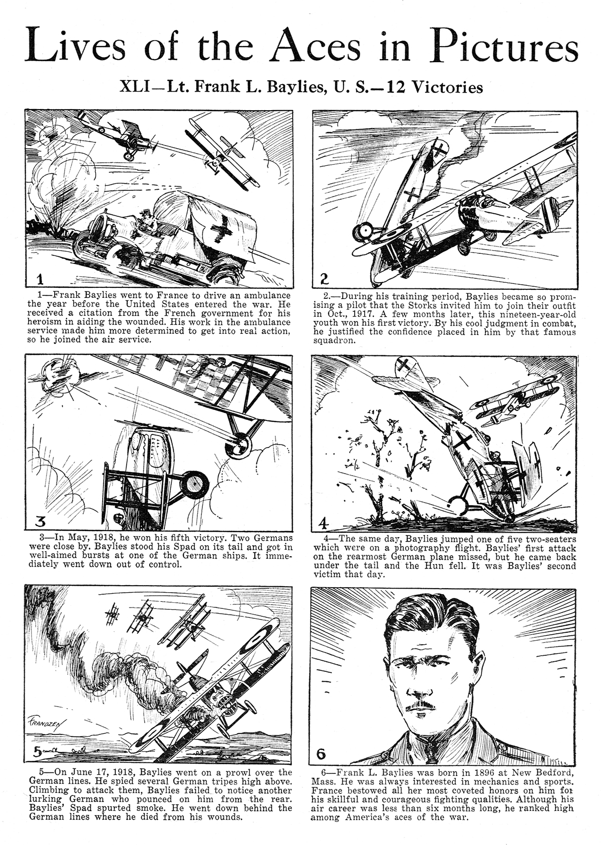 Back with another of Eugene Frandzen’s “Lives of the Aces in Pictures” from the pages of Flying Aces Magazine. The series ran for almost four years with a different Ace featured each month. This time around we have the November 1935 installment featuring the illustrated biography of a American Ace credited with 12 victories—Lt. Frank L. Baylies!