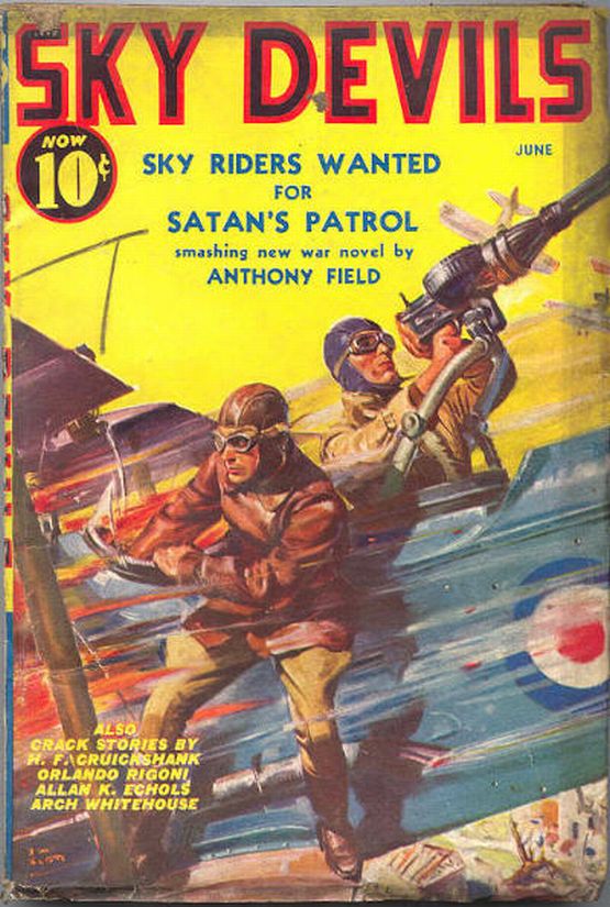 flew through the Hell Skies of 29 adventures in the pages of Dare-Devil Aces from 1932-1935. Cruickshank returned to the savior of the Western Front in six subsequent stories several years later. The first two were in the pages of Sky Devils (June 1939) and Fighting Aces (March 1940). The other four ran in Sky Fighters (1943-1946); and like Oppenheim had done with his Three Mosquitoes, so Cruickshank did with Sky Devil—he moved him to the Second World War where Bill Dawe changes his name to get into the air service and flys along side his son!