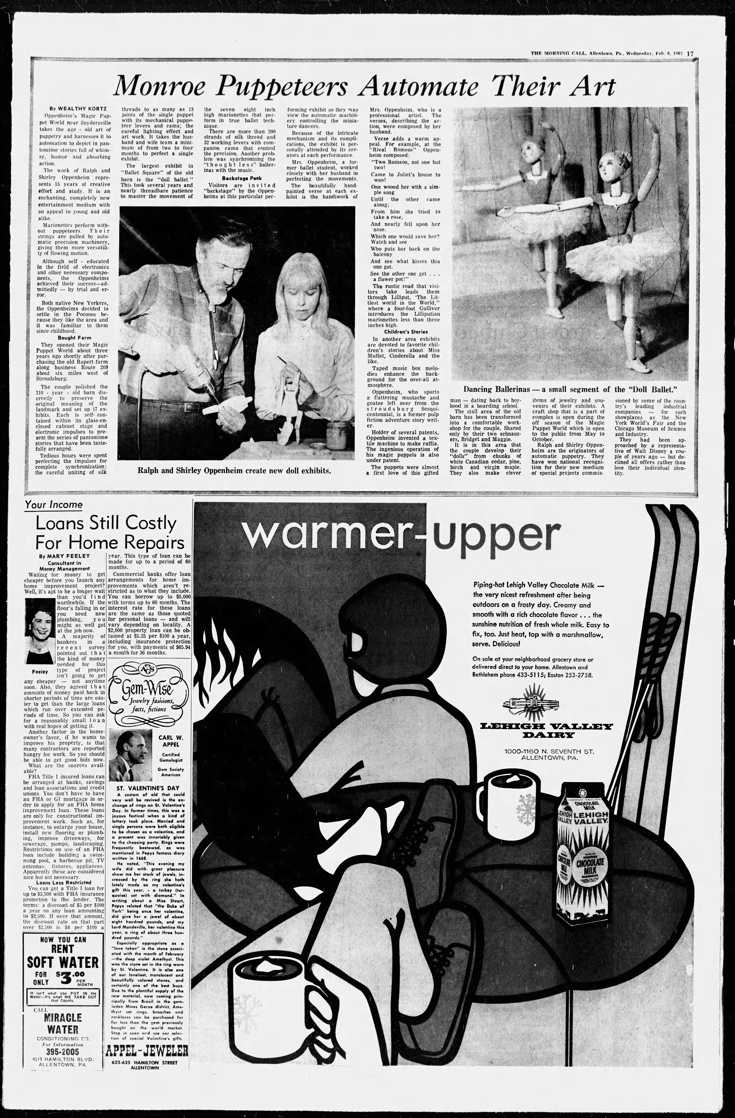 BACK in 2015 during our first Mosquito Month, we ran a series of articles from The Pocono Record that covered Oppenheim’s Magic Puppet World. Recently, I came upon another article about Ralph and Shirley Oppenheim and their Magic Puppet World—this time from nearby Allentown, PA’s The Morning Call from 1967—complete with a picture!