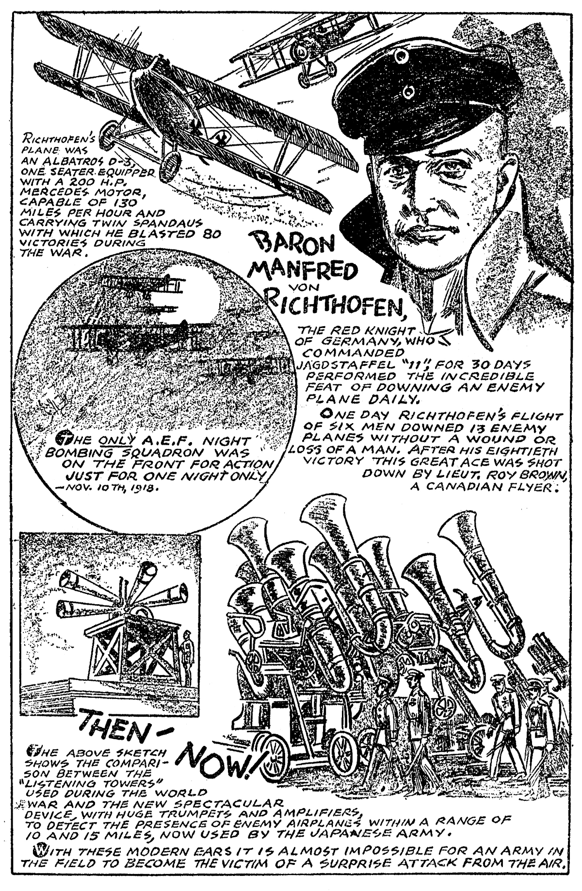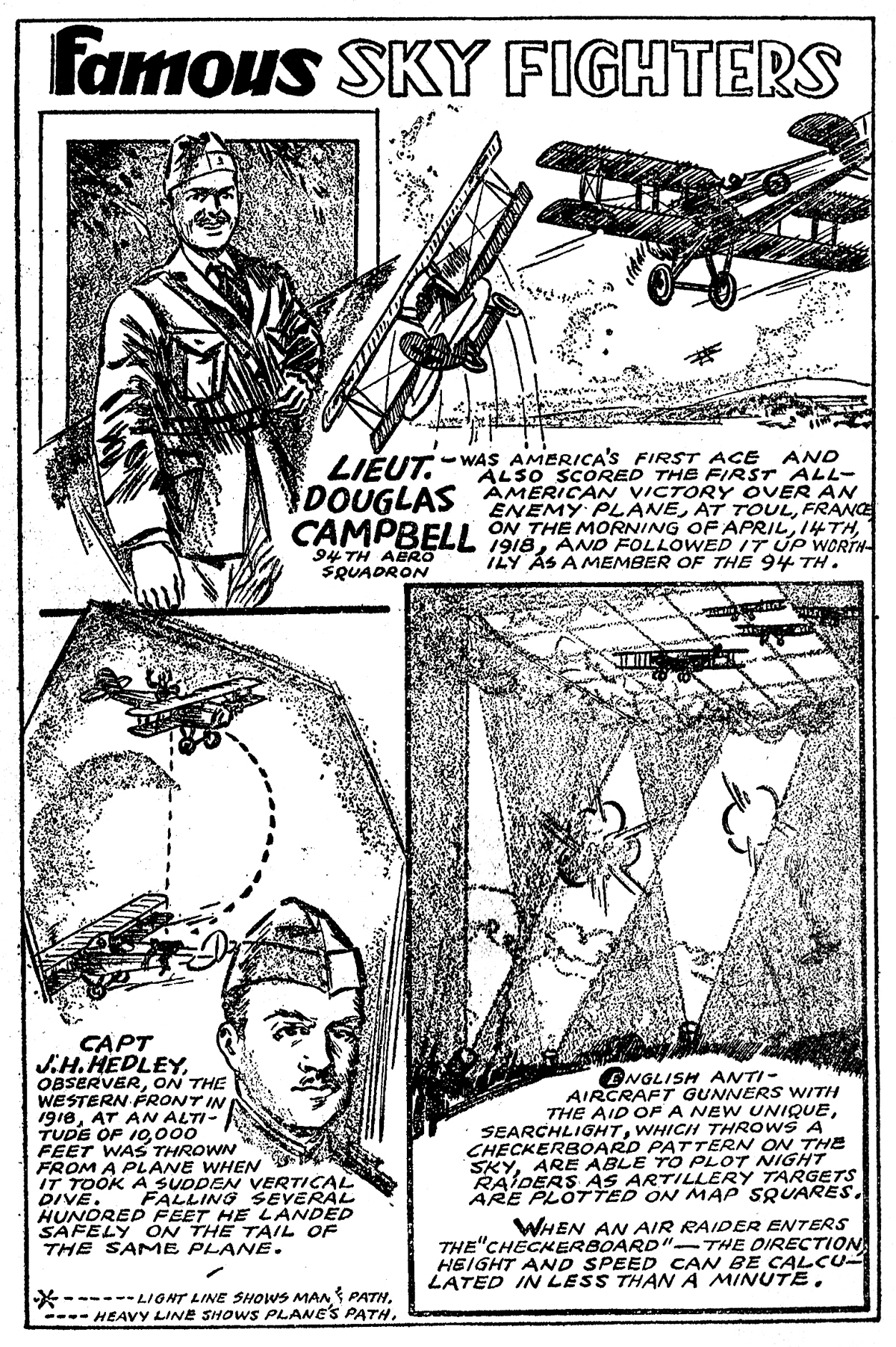 The January 1934 installment, from the pages of Sky Fighters, features America’s first Ace Lt. Douglas Campbell of the 94th Aero Squadron, observer Captain J.H. Hedley, and the incomparable Baron Manfred von Richthofen!