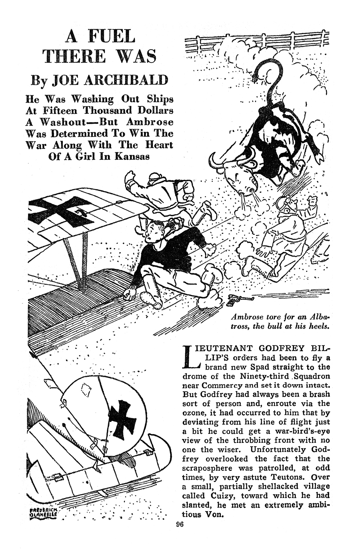 as a bonus, Joe Archibald’s first tale of Ambrose Hooley. No Muley Spinks as yet, but all the other elements are there—the 93 Pursuit Squadron, Major Bagby and Ambrose shooting krauts out of the sky like ducks in a barrel while simultaneously working all the angles. The tale of assumed identity is illustrated by our old friend Frederick Blakeslee using a more cartoonish style! So, without further Adoo, “A Fuel There Was”—