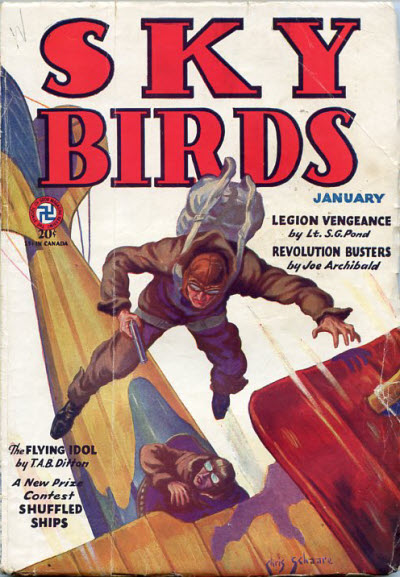 another story from one of the new flight of authors on the site this year—Andrew A. Caffrey. Caffrey, who was in the American Air Service in France during The Great War and worked for the air mail service upon his return, was a prolific author of aviation and adventure stories for both the pulps and slicks from the 1920’s through 1950. For the second issue of Sky Birds, Caffrey tells the story of Lieutenant Mike Harris—a.k.a. “Coupe Mike” due to his proclivity to overuse the coupe button during his training—fresh up from Issoudon after extensive training.