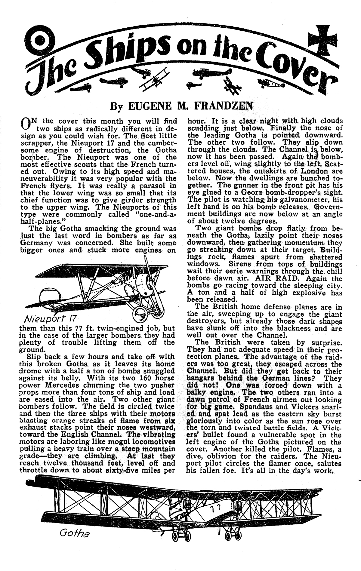 Under cover of darkness they seized the opportunity to throw panic into the hearts of the Frenchmen. They loaded one of their giant dirigibles with ton after ton of deadly explosive and sent it through the blackness to drop its burden of disaster into the homes of the defenseless women and children.