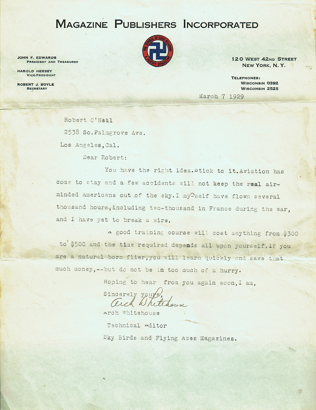 When Charles Lindbergh made his solo flight to Paris in 1927, Whitehouse wrote a column about it. A friend who read it suggested he try writing for one of the aviation pulp magazines. He submitted a story, and received a check for $100. The editor was impressed by the authenticity of the story, and hired Whitehouse to check the facts in other stories being submitted.