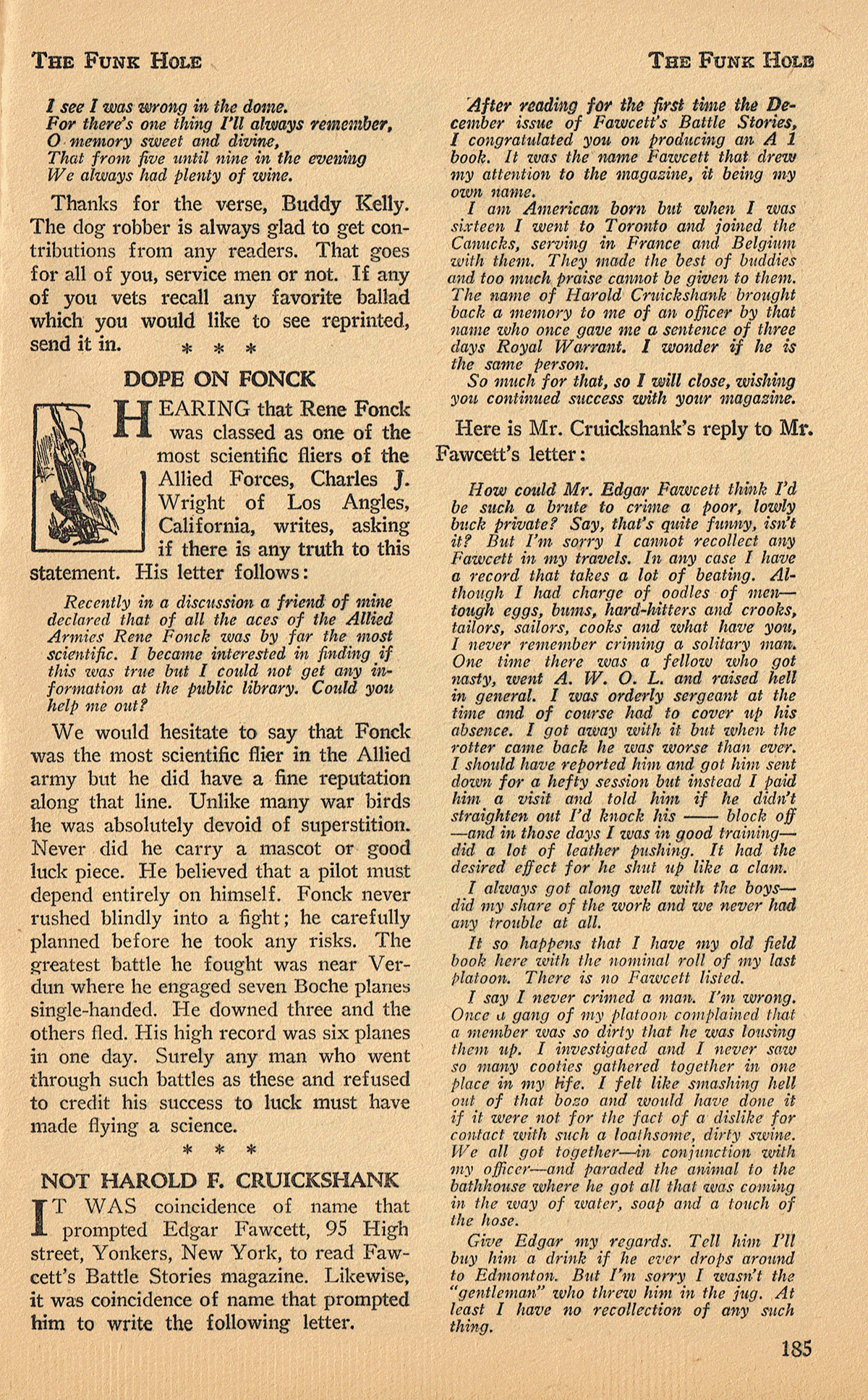 going to find in Fawcett’s Battle Stories’ letters column, The Funkhole. Frequently there is information about their authors or even letters from them. In the May 1929 issue I was surprised to find a letter from Harold F. Cruickshank himself! It was in response to a reader thinking he may have come afoul of him during the late great hate! (The portrait of Mr. Cruickshank below was in an ad a few pages later!)