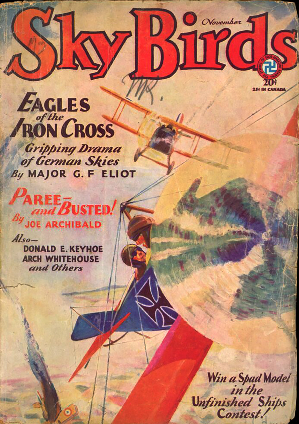 THE chivalry of the clouds—the code that persisted even in moments of grim tragedy—is depicted on this month’s cover. The German plane, riddled by Allied bullets, is going down—a flaming coffin. Its pilot, about to take the leap that means death, turns to make one last gesture—a salute to the Allied pilot who has sent him down—and his conqueror answers the salute. Fighting for different causes though they were, those two airmen, like all the true knights of the air, held one thing highest—Courage, in life or in death!