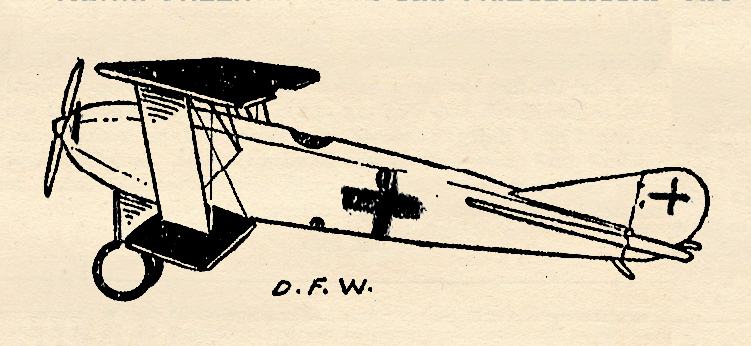 Although the D.F.W. has no front gun it has features of stability, speed and power which the French monoplane lacks. This type of D.F.W. at the beginning of the war had shattered all existing cross country flights. It was designed by Cecil Kny and was Germany’s first full streamlined plane. The strut bracing between the fuselage and the upper wing is practically the same as the famous Sopwith one and one-half strutter. The covering of the in-terplane struts and the undercarriage struts were helpful evidently in appearance only, because later models of this ship left the struts exposed.