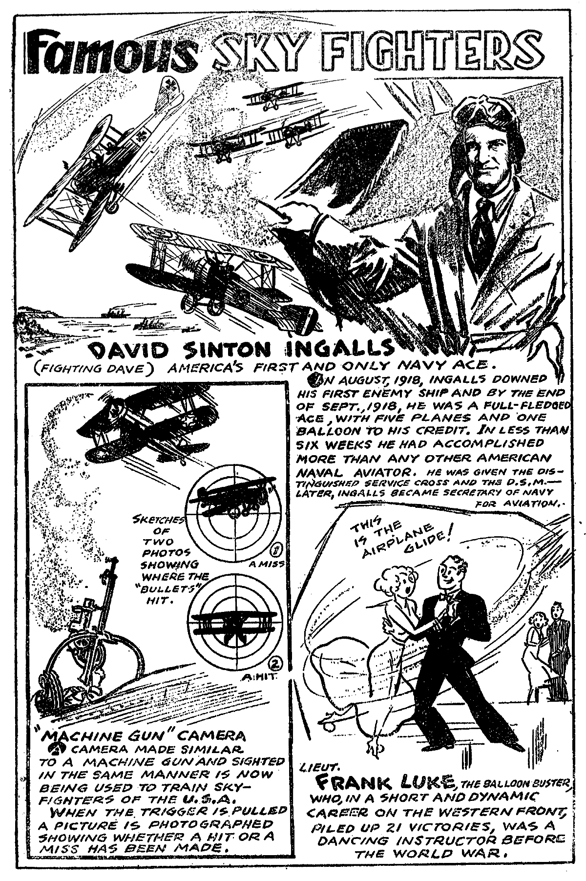 The March 1934 installment, from the pages of Sky Fighters, features “Fighting Dave” himself—David Sinton Ingalls, Lt. Frank Luke, and Germany’s Lt. Werner Voss!