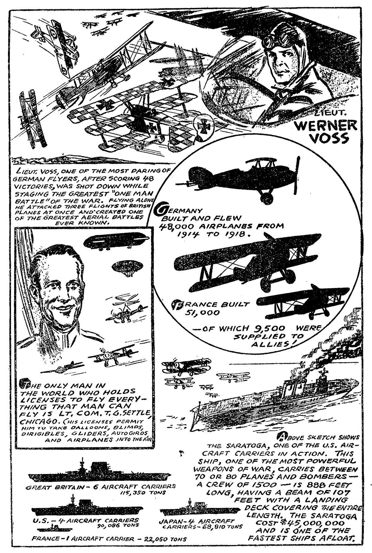 STARTING in the October 1933 issue of Sky Fighters and running almost 5 years, Terry Gilkison’s “Famous Sky Fighters†was a staple of the magazine. Each month Gilkison would illustrate in a two page spread different Aces that rose to fame during the Great War.