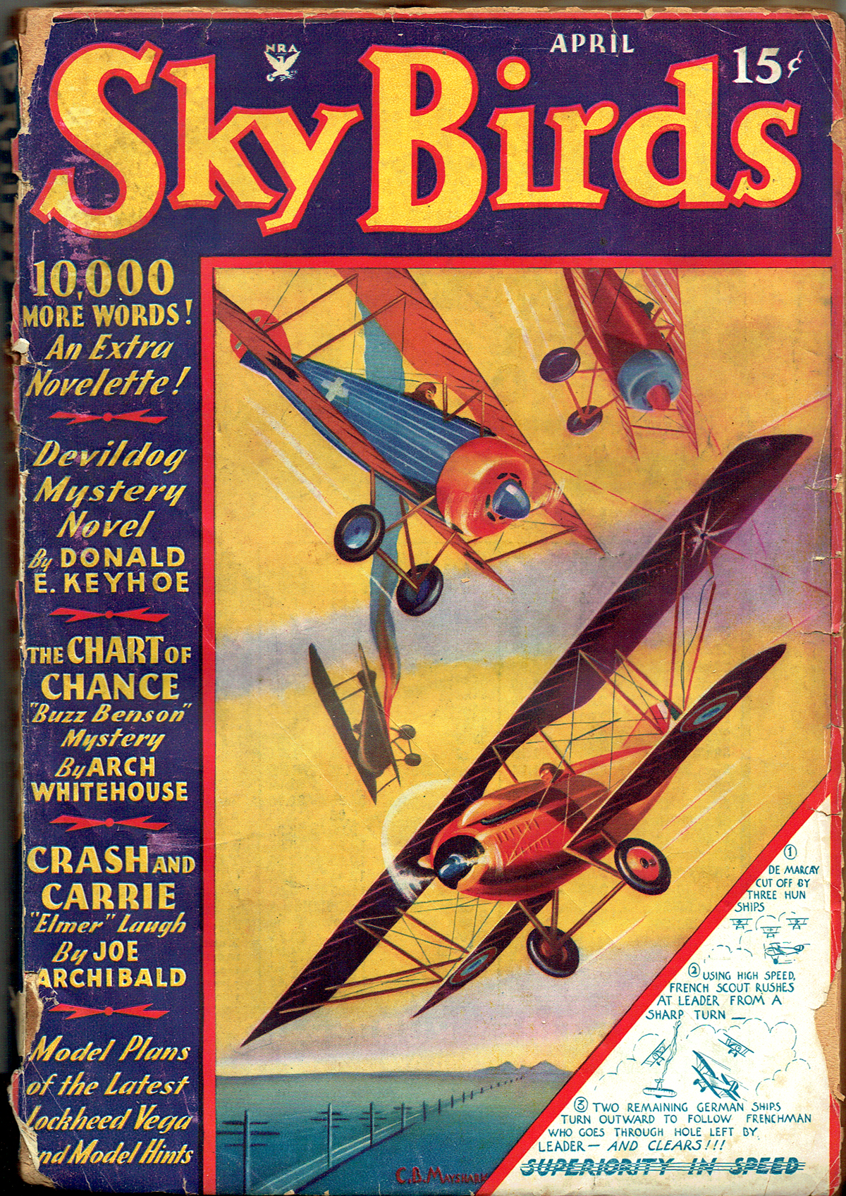 THIS May we’re celebrating the genius that is C.B. Mayshark! Mayshark took over the covers duties for Sky Birds with the July 1934 and would paint all the remaining covers until it’s last issue in December 1935. At the start of his run, Sky Birds started featuring a different combat maneuver of the war-time pilots. The lower corner presenting a play-by-play of that month’s maneuver with the remainder of the cover illustrating it. For April 1935 issue Mayshark gives us “Superiority in Speed!”