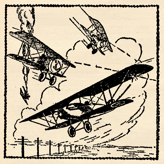 Banking around in a tight turn so as to attack from an angle, the Frenchman opens his throttle wide and comes tearing down across the sky, head-on into the enemy formation. One burst of fire is enough to knock the leader out of position, and as he falls rapidly in a sickening spin, blue smoke begins curling up around his fuselage. Suddenly he is a mass of fire—a flamer!