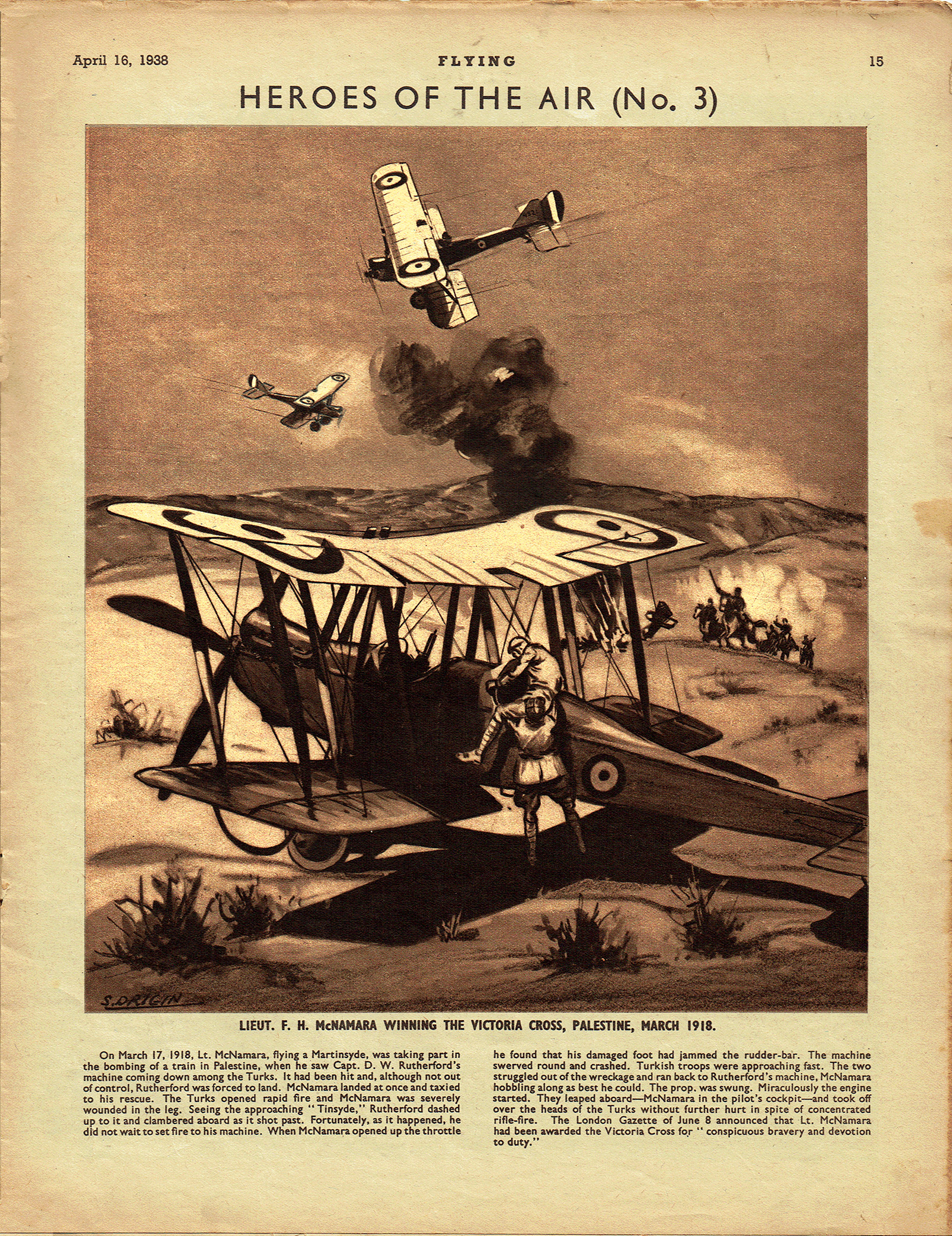 ON MARCH 17, 1918, Lt. McNamara, flying a Martinsyde, was taking part in the bombing of a train in Palestine, when he saw Capt. D.W. Rutherford’s machine coming down among the Turks. It had been hit and, although not out of control, Rutherford was forced to land. McNamara landed at once and taxied to his rescue. The Turks opened rapid fire and McNamara was severely wounded in the leg. Seeing the approaching “Tinsyde,” Rutherford dashed up to it and clambered aboard as it shot past. Fortunately, as it happened, he did not wait to set fire to his machine. When McNamara opened up the throttle