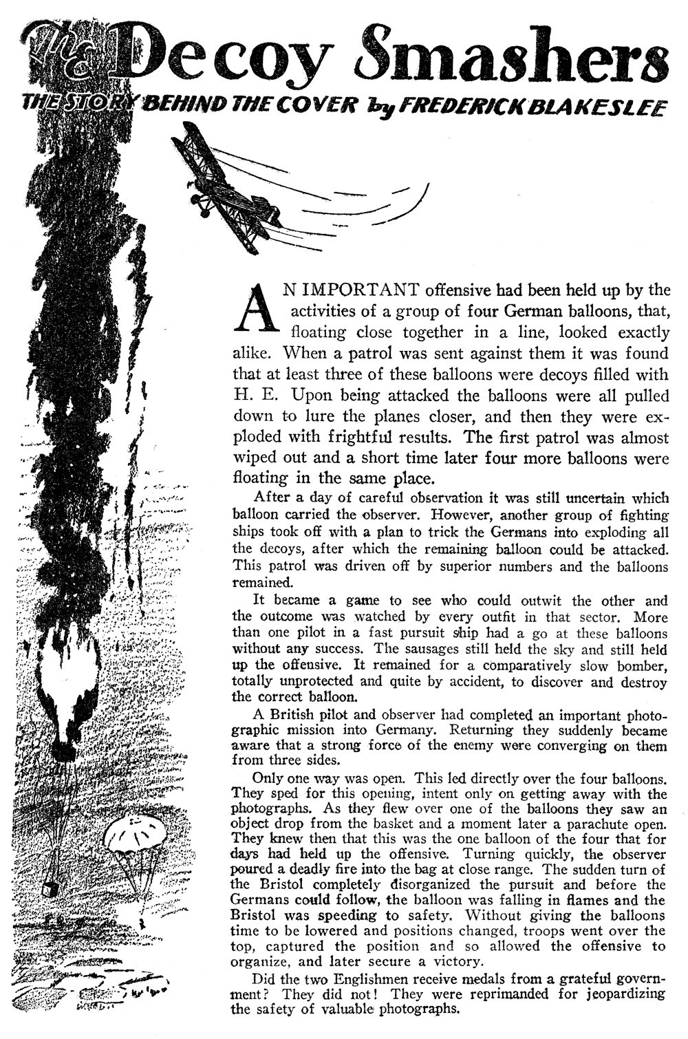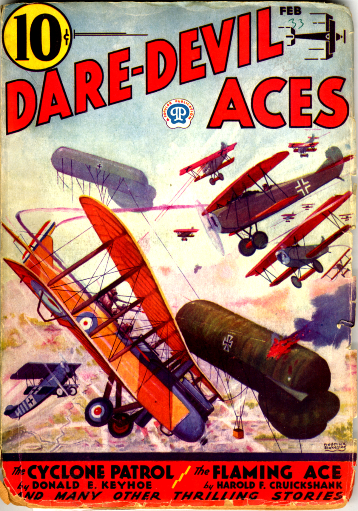 However, here is a complaint. Wasn’t there anything else besides pursuit ships in the World War? Or were they the only ones you knew how to fly? Seems to me that I’ve read some slick yarns in this mag that had to do with bombing raids. Do you know anything about the technical side of bombing, or are you just plain dumb about that sort of thing?Henry Craveil