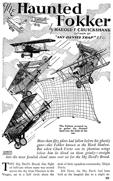 The contraption shown on the cover was supposed to have been invented just after our entry into the war. The idea was for a bomber to drop the net and then the combat ships were to lure the enemy into it, or else the combat ship was to carry the net itself. The story goes that the inventor offered it to the U.S. government, then to France and England and finally into German hands. (A similar device was employed in the Sky Devil story “The Haunted Fokker” (Dare-Devil Ace, April 1933))