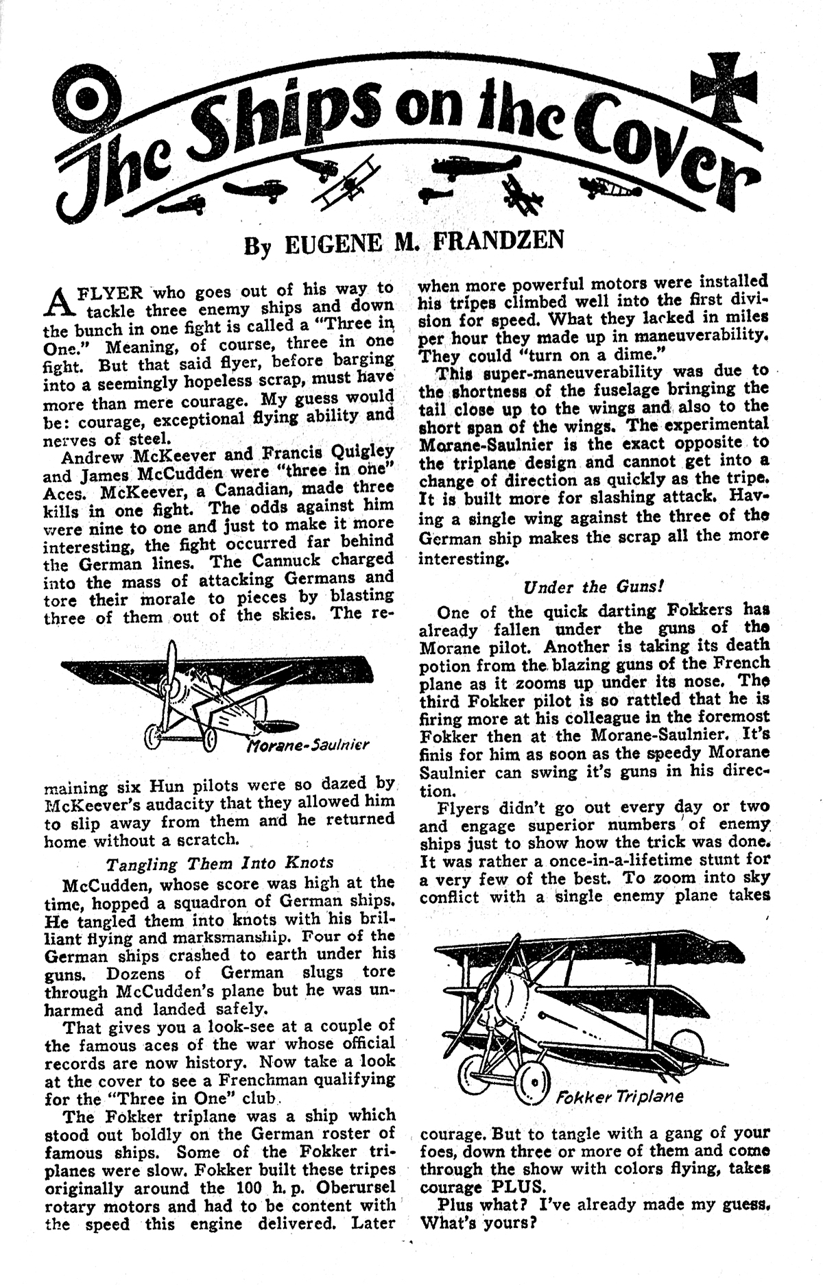 That gives you a look-see at a couple of the famous aces of the war whose official records are now history. Now take a look at the cover to see a Frenchman qualifying for the “Three in One” club.