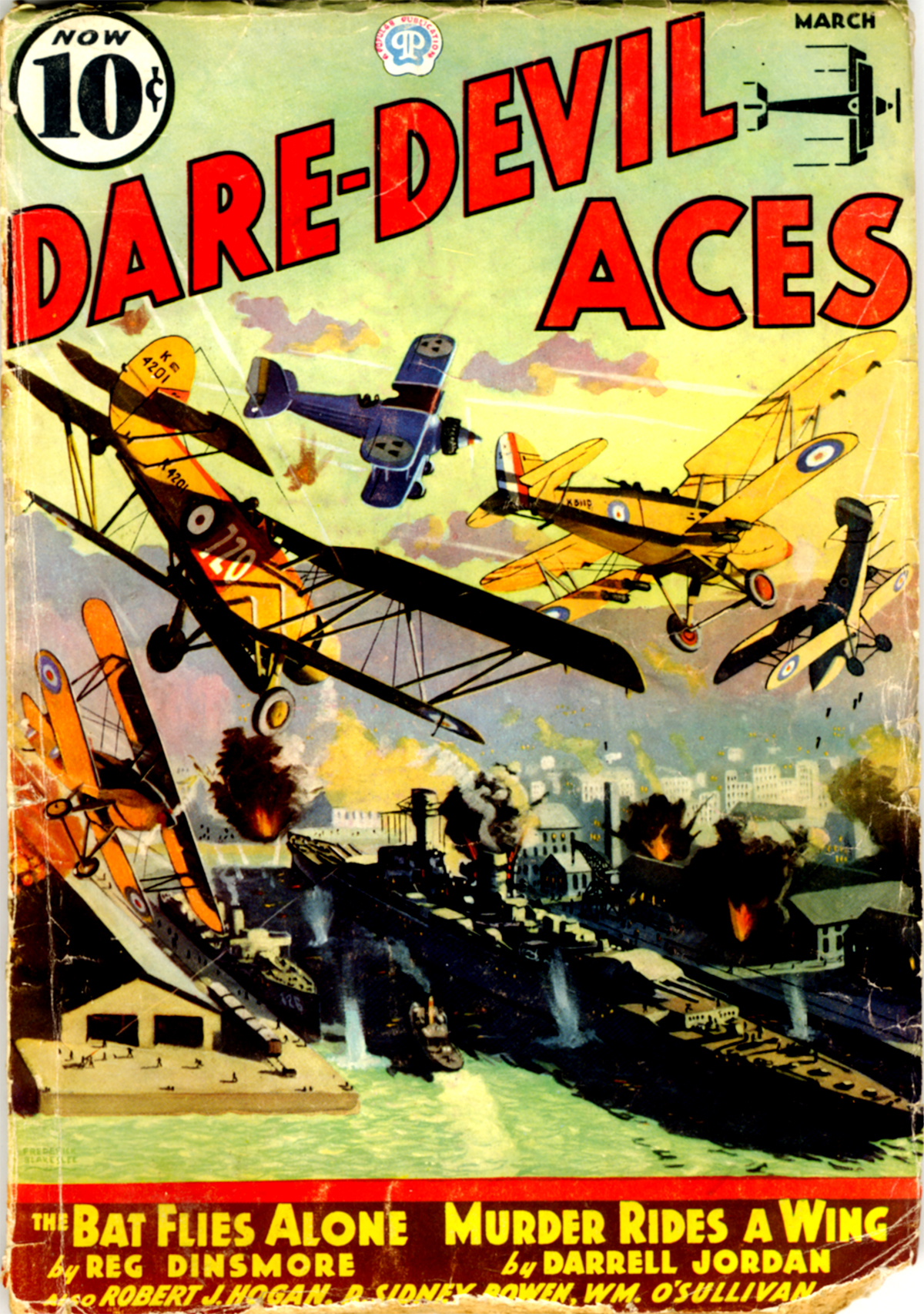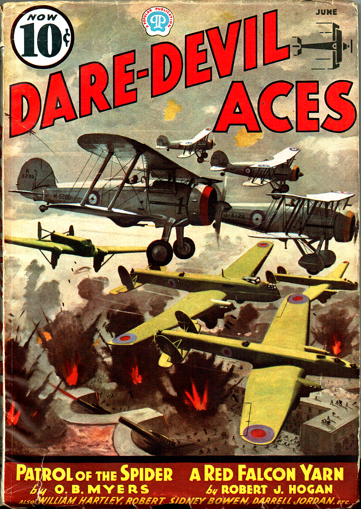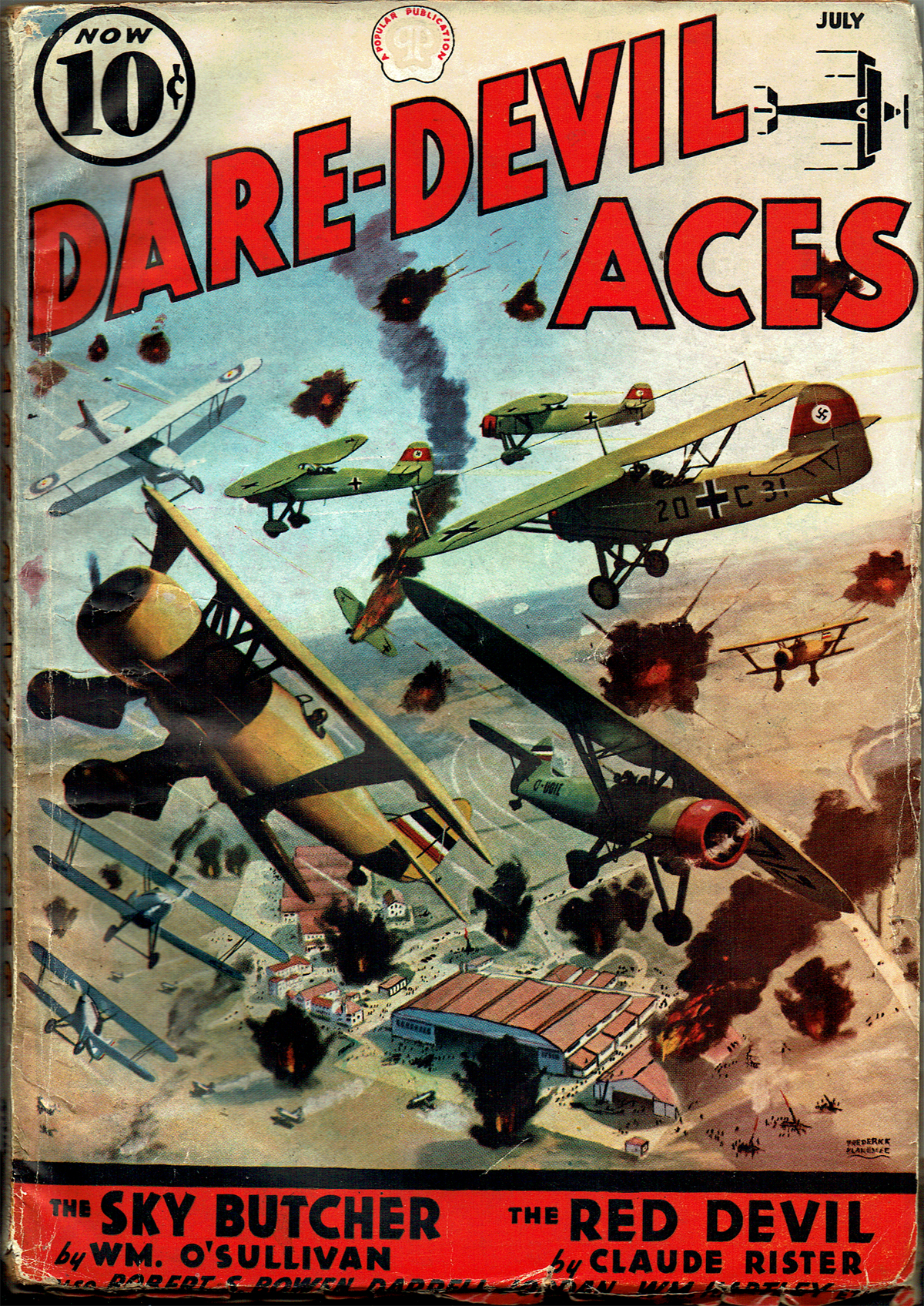Frederick Blakeslee painted all the covers for the entire run of Dare-Devil Aces. And each of those covers had a story behind it. At this point in the magazine’s run, Mr. Blakeslee had started doing his “Planes by the Numbers” covers where he has so many planes on the cover, he had to explain which plane is what with a legend on the story behind the cover page. For the August issue we get a bit of a throwback where Mr. Blakeslee turns his attention to the Fairey Fantome!
