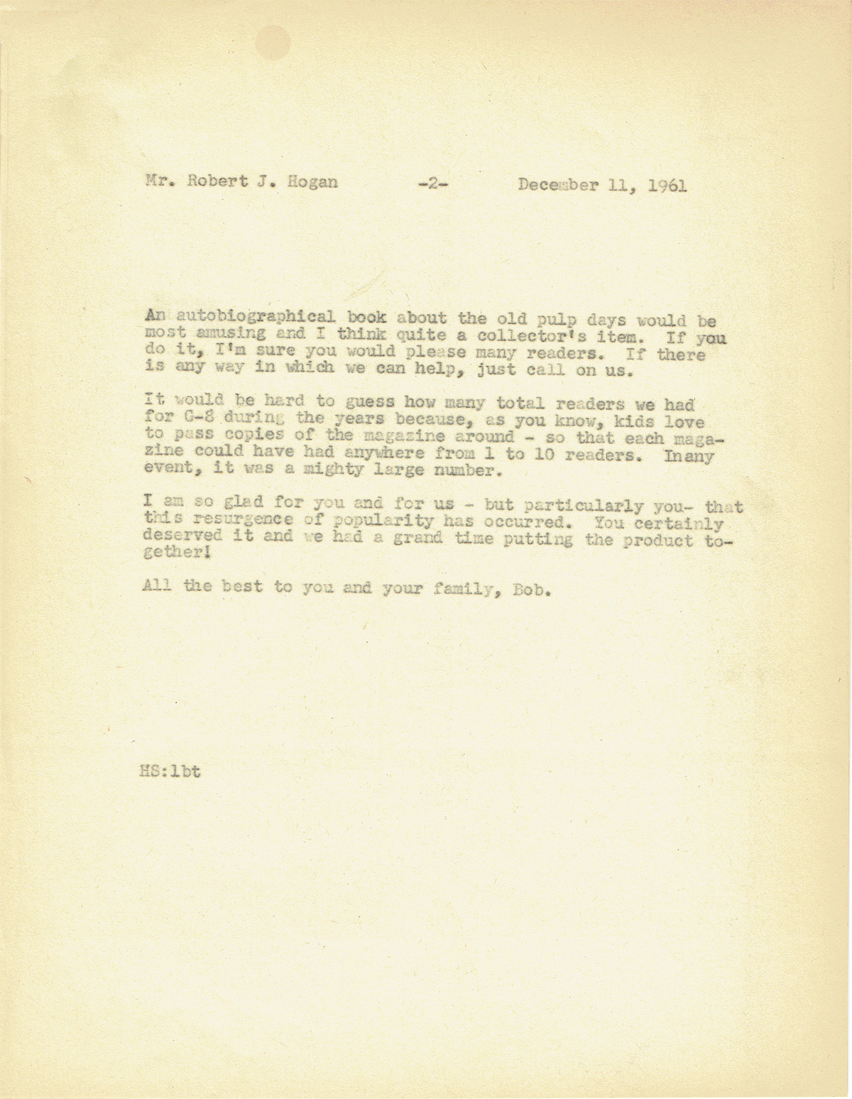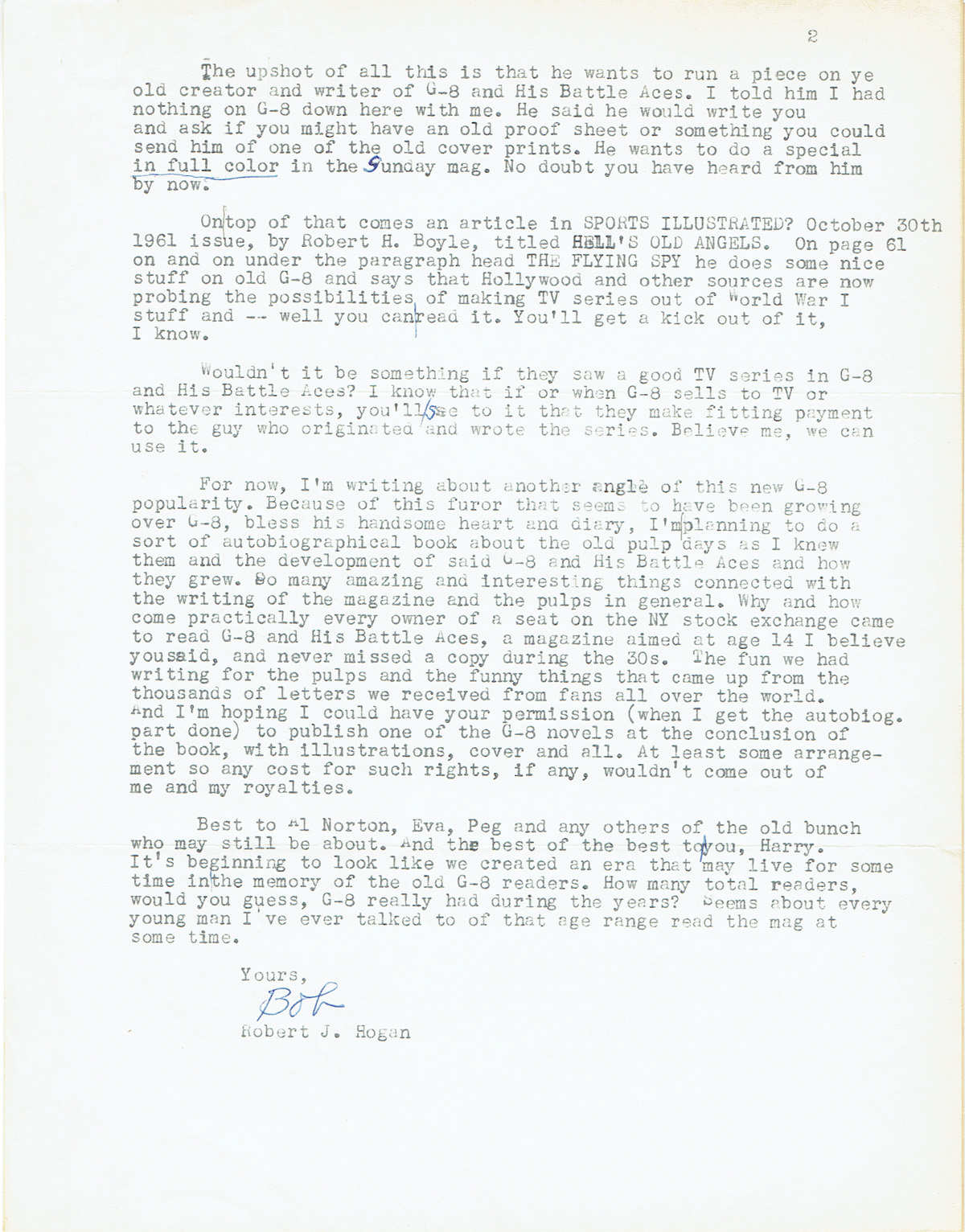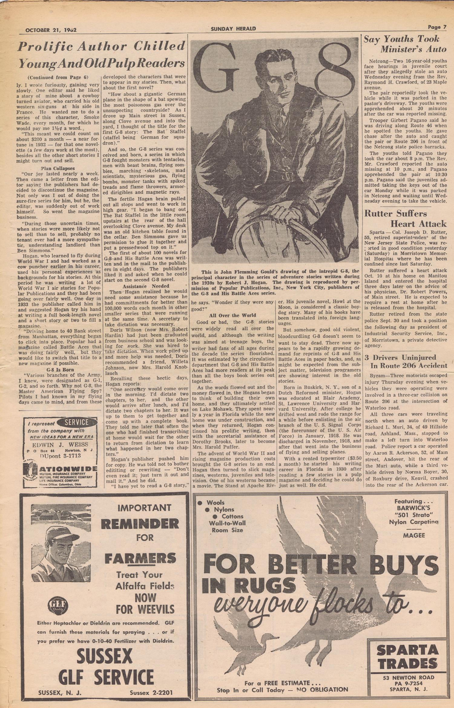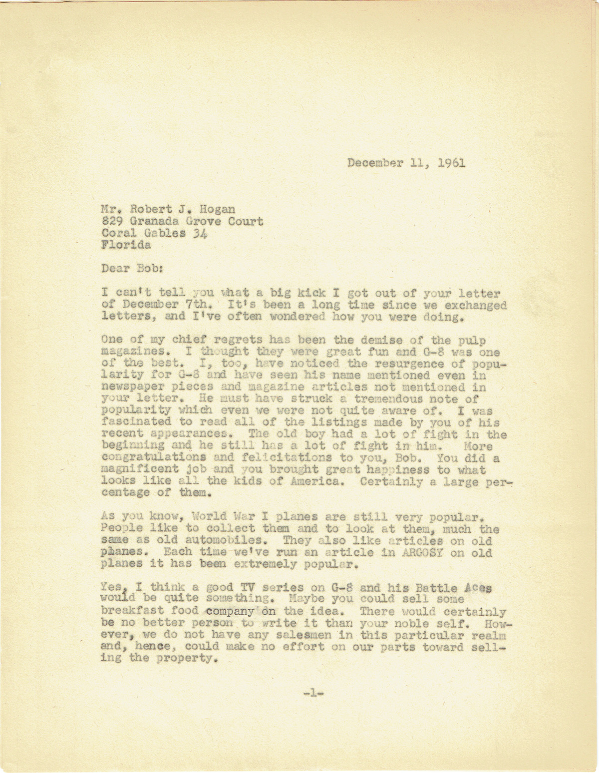 Hogan still gets letters from old fans who wish their own kids could read G-8. But alas, that’s almost impossible. A mint copy which once sold for 10 cents might bring $50 today, if you could find one.
