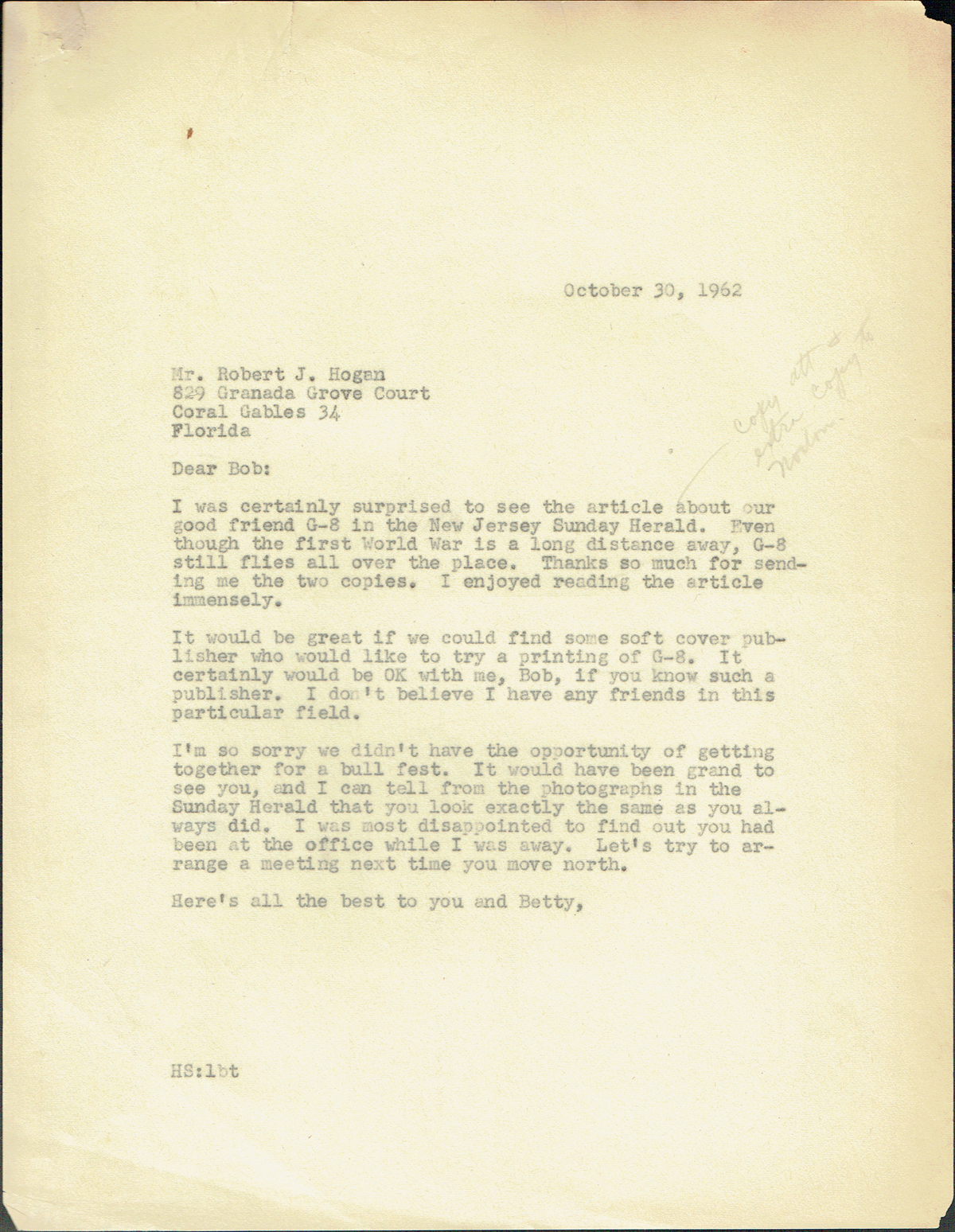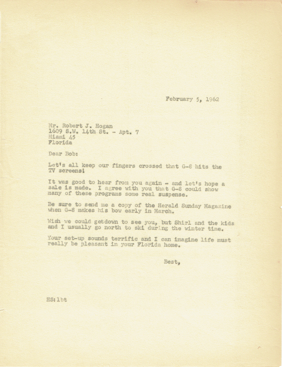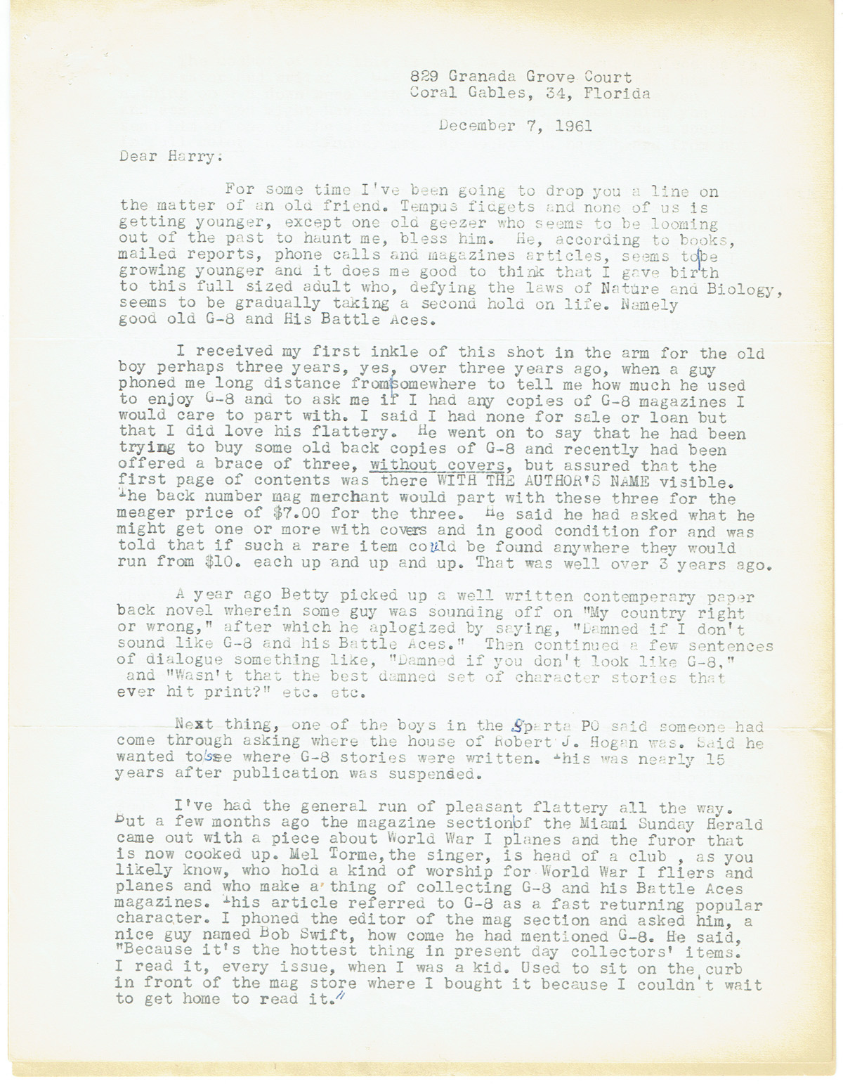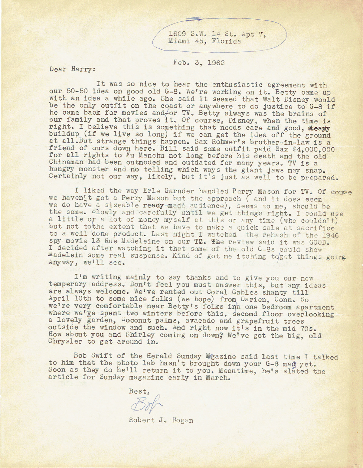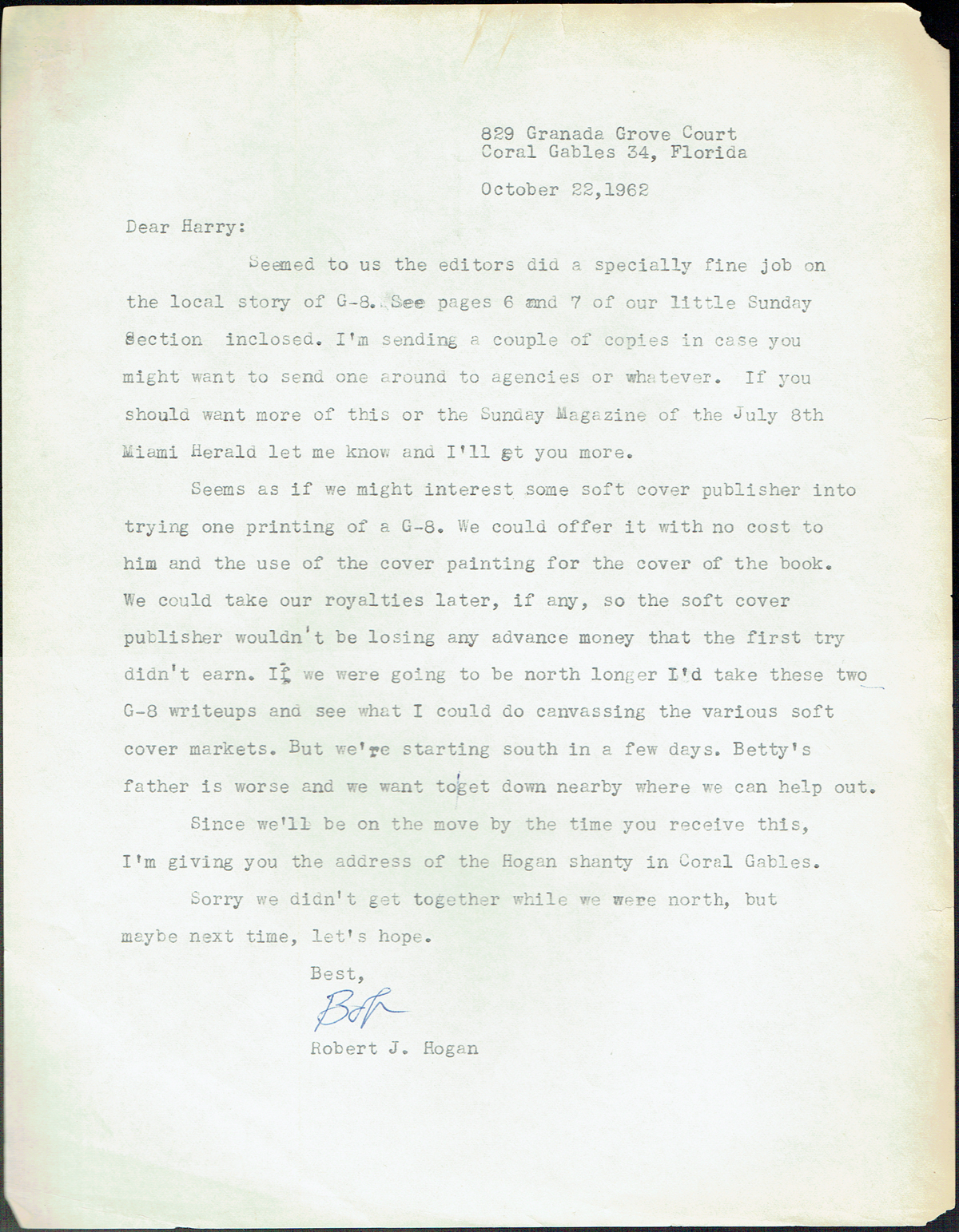 Hogan has slowed a bit lately. He and his wife Betty, winter in Coral Gables, summer in New Jersey. But the typewriter still clatters though the pace has relaxed. What Hogan would like to do now is re-issue G-8 in some form or other, for nostalgia fans maybe make G-8 a TV show.