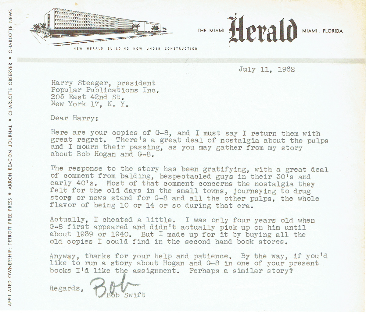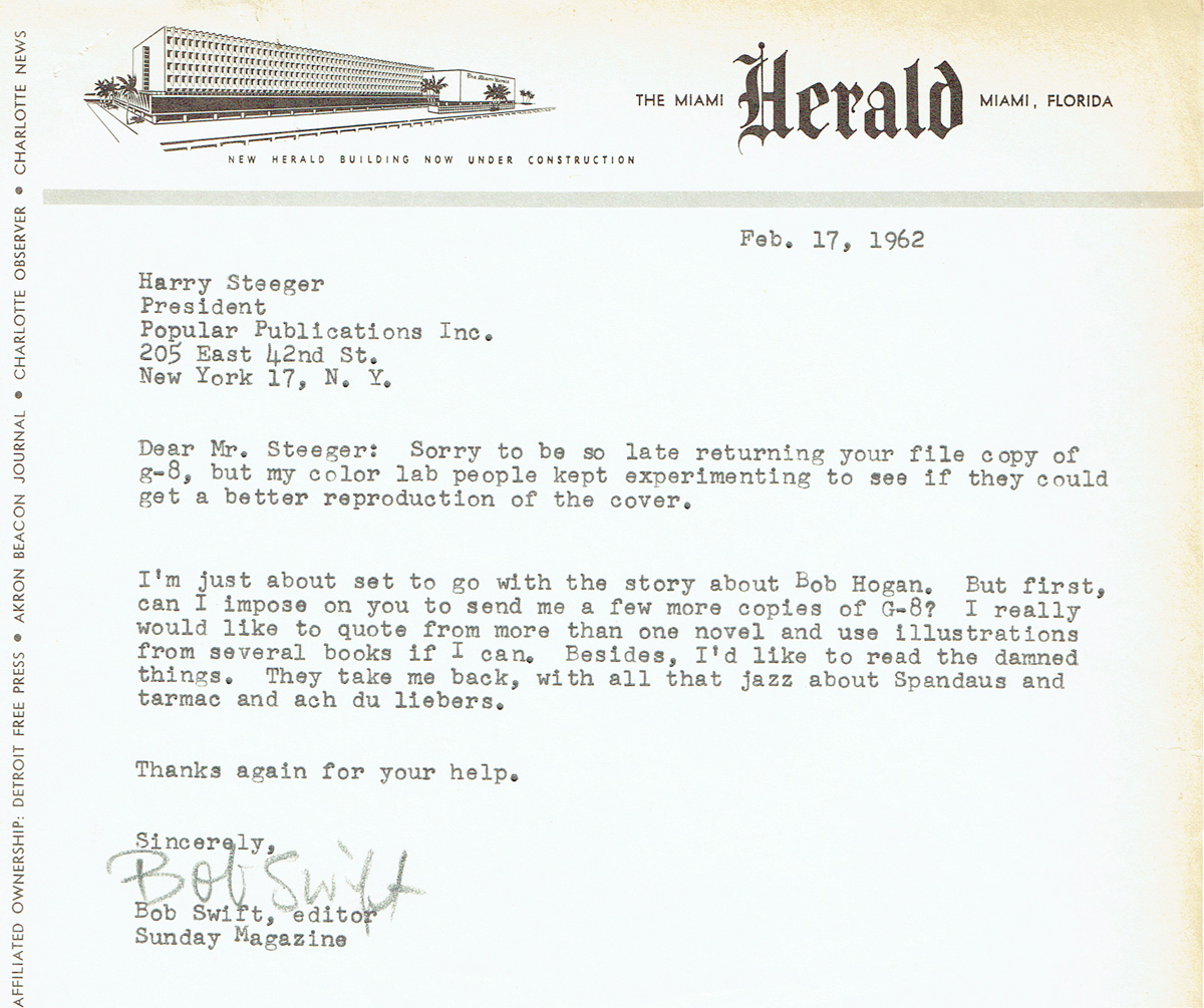 correspondence between Henry Steeger, Robert J. Hogan, and Bob Swift that Pulp Historian Don Hutchison handed us at PulpFest. The letters with Bob Swift concerned a feature article he was writing for the Miami Herald Sunday Magazine. Although Don had given us the letters, the package did not include the Miami Herald Sunday Magazine feature story. But thanks to Newspapers.com, we have finally got a copy of it to share with our readers.