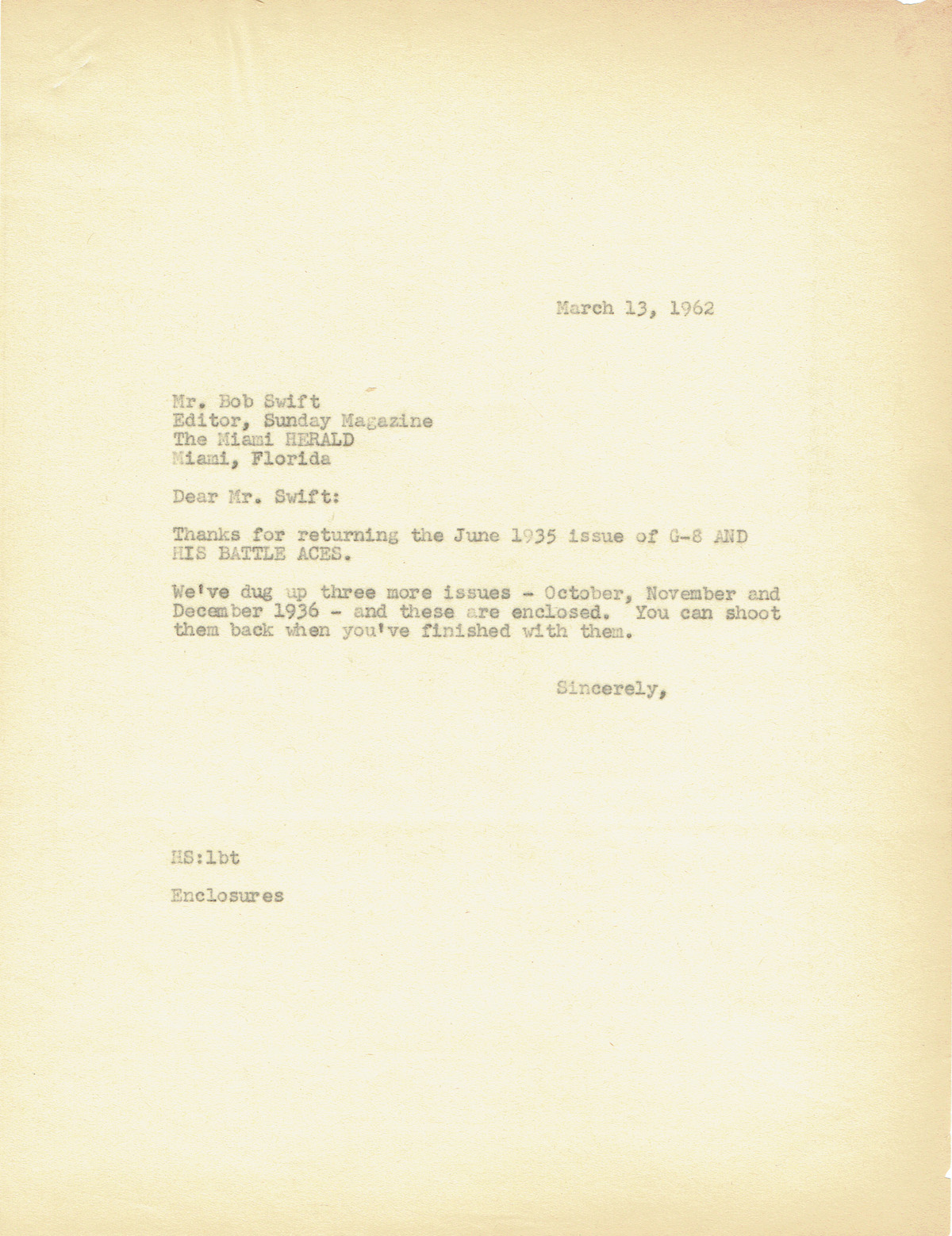 “G-8 was aimed at boys about 14 years old, but I had fans ail ages and all over the world. One was president of a street car company in Scotland. Another was a Bengal Lancer in India.’