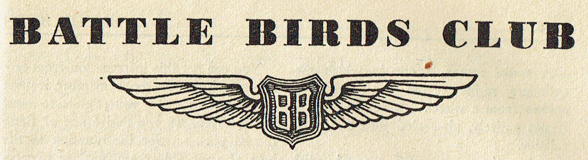 The Battle Birds Club was open to all air-minded readers. Anyone could join by simply stating they wanted to and they would be sent a blue membership card. This card would display the members group-squadron-flight number, derived as follows: The country would be broken down into three regions—these three being the 1st, 2nd, and 3rd Pursuit Groups—and a fourth, FL, for foreign readers classified in the ‘Foreign Legion’; each state a squadron number; and every 8 members within said state a lettered flight as they are recorded.