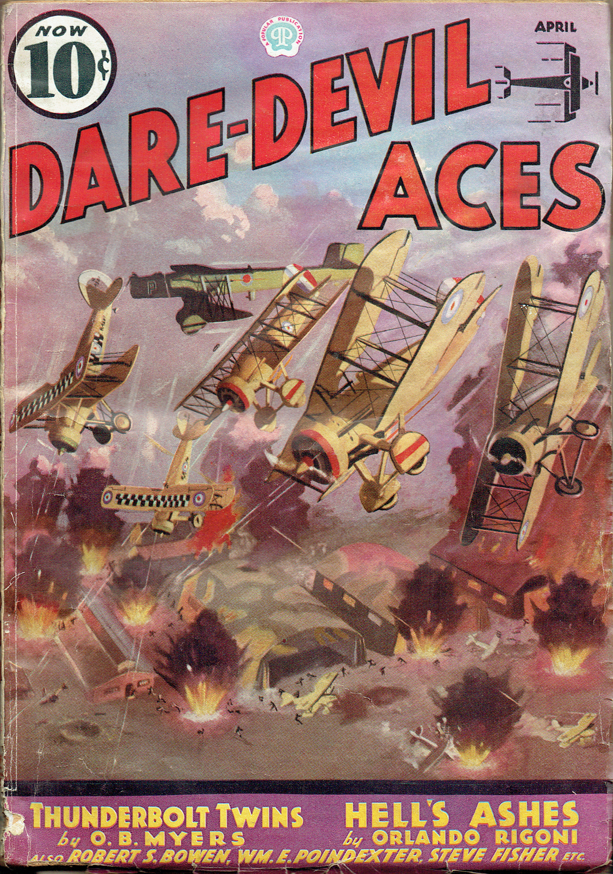 FREDERICK BLAKESLEE painted all the covers for the entire run of Dare-Devil Aces. And each of those covers had a story behind it. For the June 1937 Dare-Devil Aces, Mr. Blakeslee’s paints a flock of Fairey “Hendons” bombing a big gun emplacement along with a flight of Gloster “Gauntlets”.