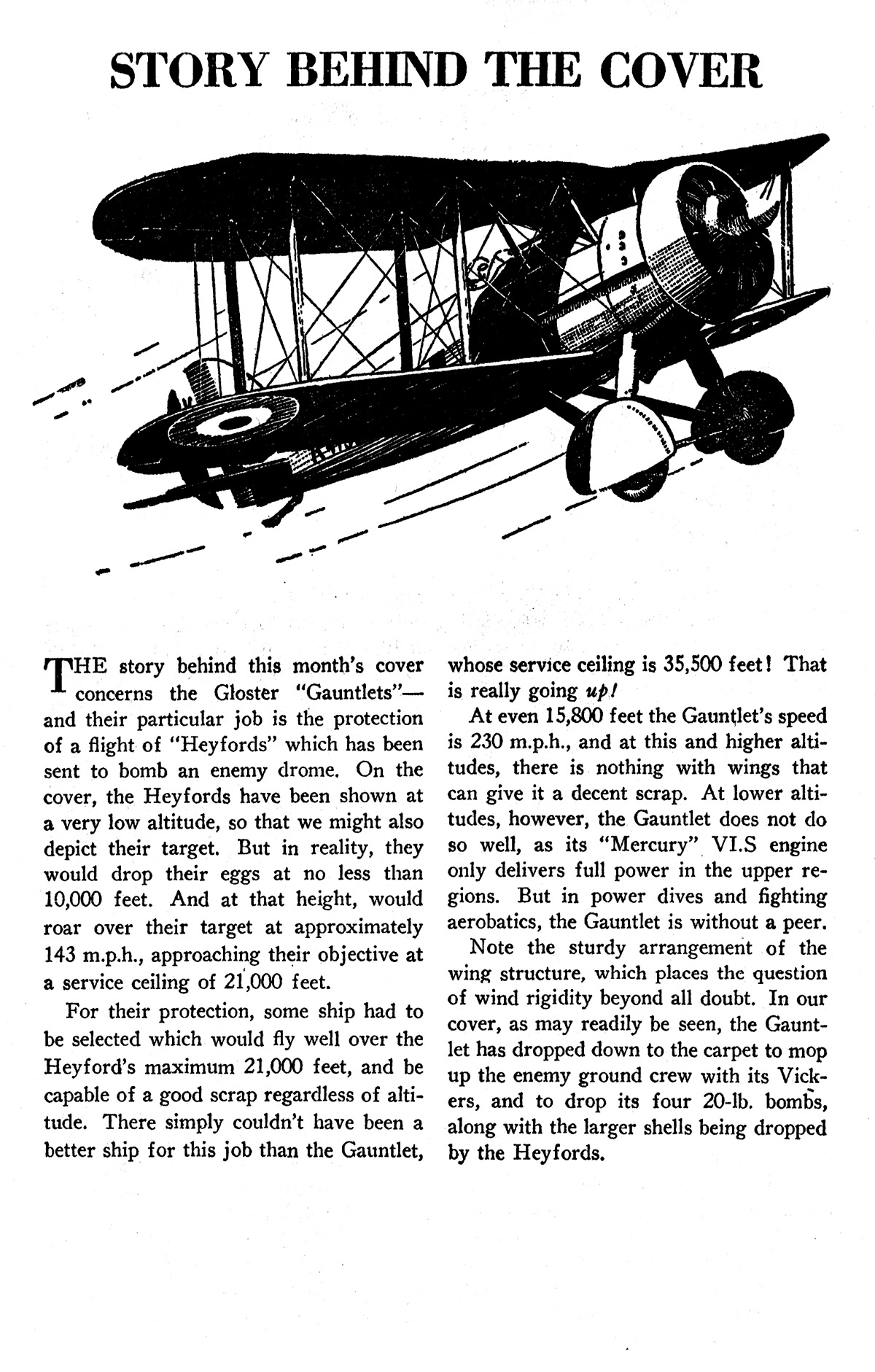ON THE cover this month you will find a flock of Fairey “Hendons” bombing a big gun emplacement. They’ve come over just around dusk, when everything is quiet, and they’re giving the boys below plenty of hell.