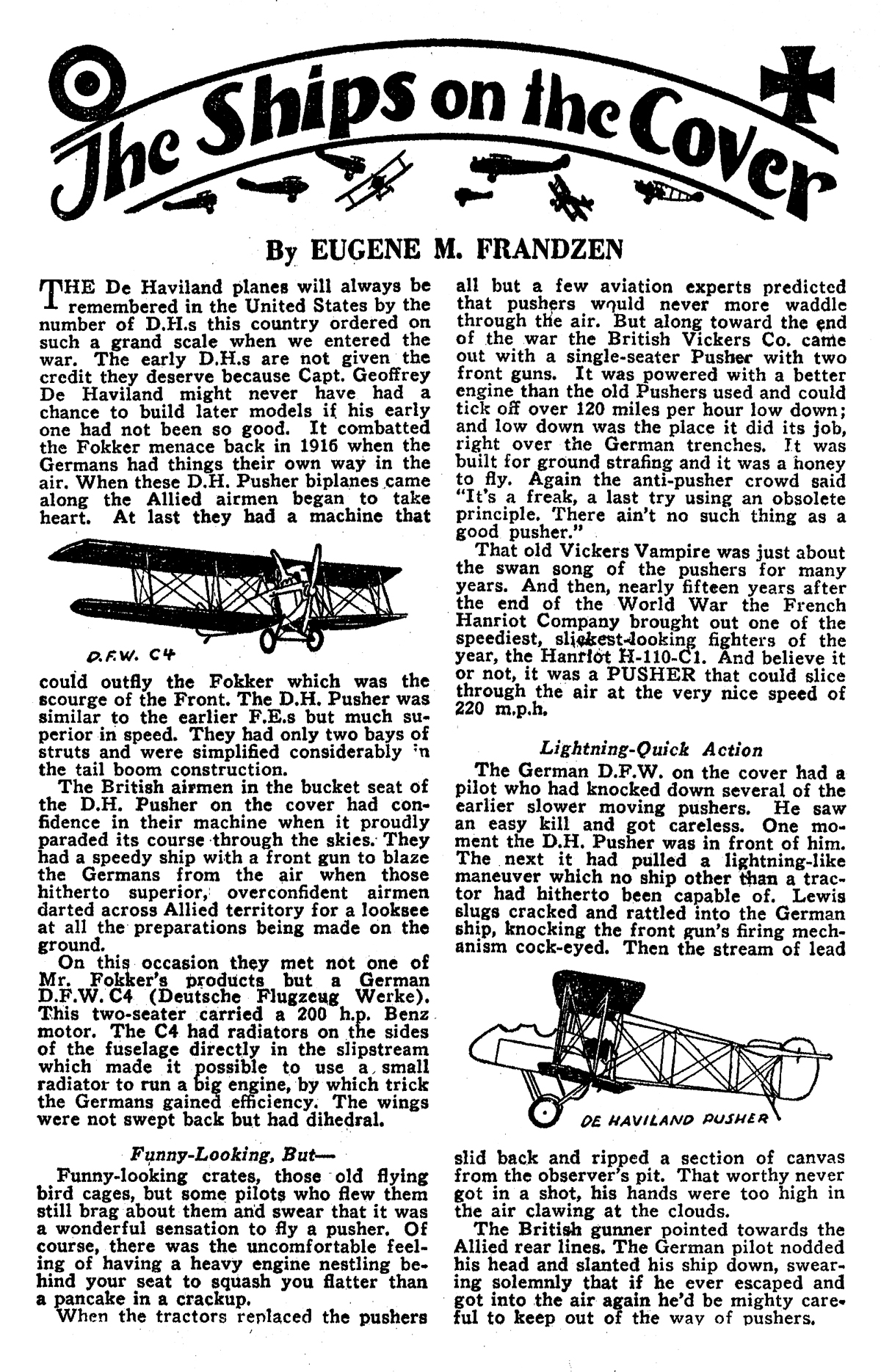 The German D.F.W. on the cover had a pilot who had knocked down several of the earlier slower moving pushers. He saw an easy kill and got careless. One moment the D.H. Pusher was in front of him. The next it had pulled a lightning-like maneuver which no ship other than a tractor had hitherto been capable of Lewis slugs cracked and rattled into the German ship, knocking the front gun’s firing mechanism cock-eyed. Then the stream of lead slid back and ripped a section of canvas from the observer’s pit. That worthy never got in a shot, his hands were too high in the air clawing at the clouds.