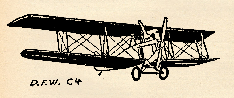 On this occasion they met not one of Mr. Fokker’s products but a German D.F.W. C4 (Deutsche Flugzeug Werke). This two-seater carried a 200 h.p. Benz motor. The C4 had radiators on the sides of the fuselage directly in the slipstream which made it possible to use a small radiator to run a big engine, by which trick the Germans gained efficiency. The wings were not swept back but had dihedral.