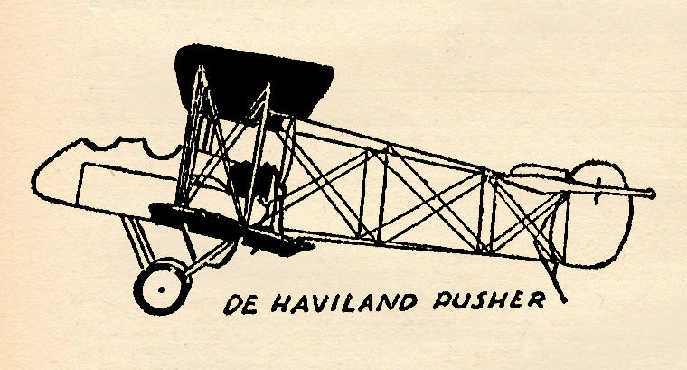 The British airmen in the bucket seat of the D.H. Pusher on the cover had confidence in their machine when it proudly paraded its course through the skies. They had a speedy ship with a front gun to blaze the Germans from the air when those hitherto superior, overconfident airmen darted across Allied territory for a looksee at all the preparations being made on the ground.