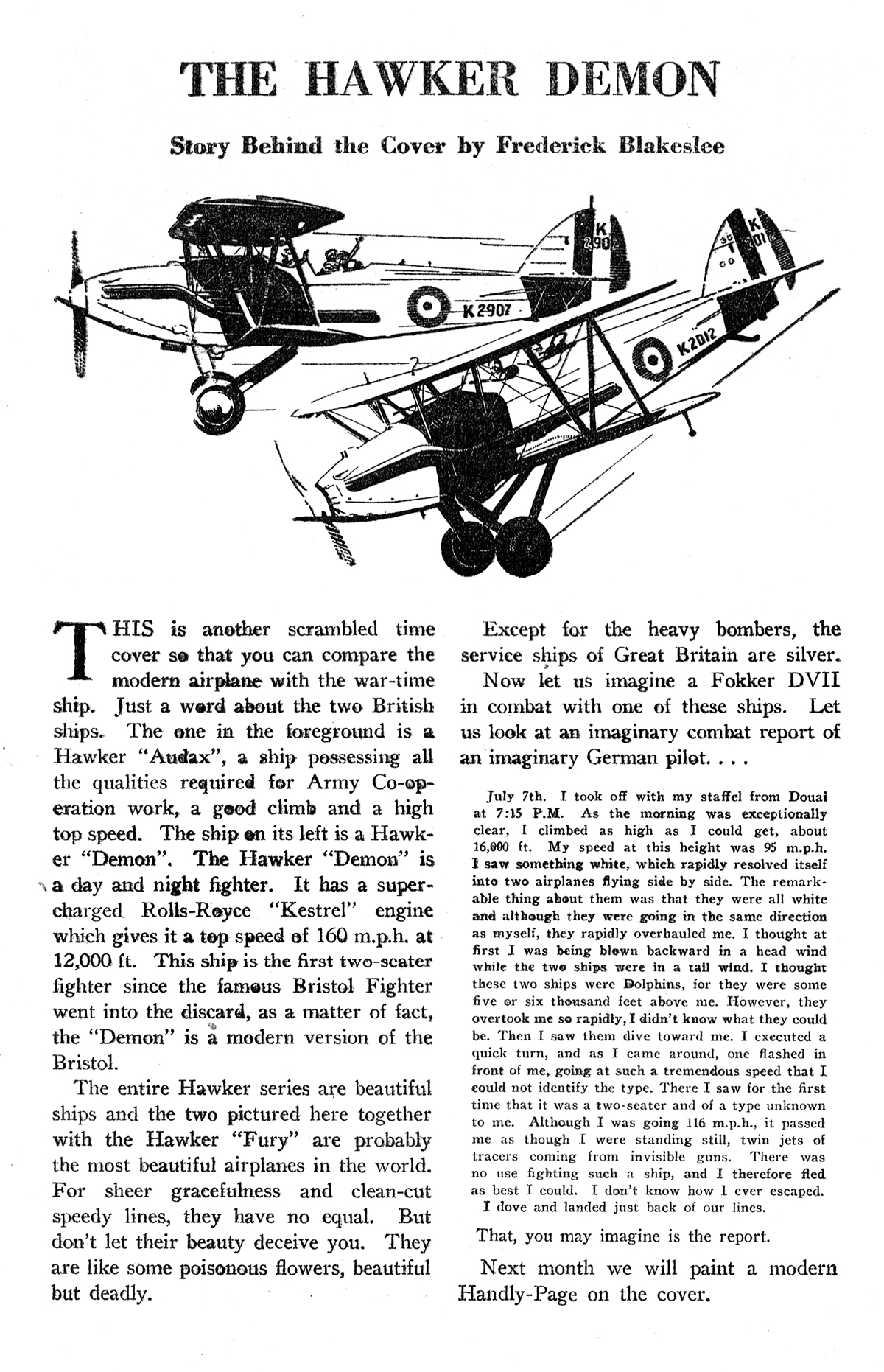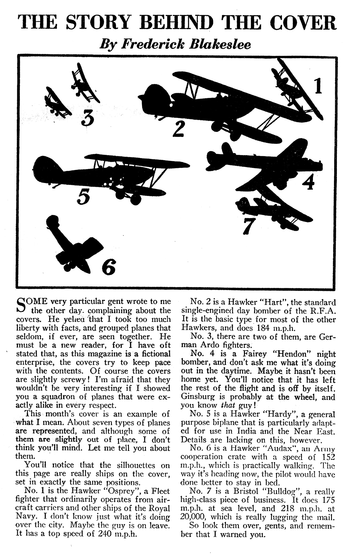 Frederick Blakeslee painted all the covers for the entire run of Dare-Devil Aces. And each of those covers had a story behind it. The February 1937 Dare-Devil Aces’ cover is the first of Mr. Blakeslee’s “Planes by the Numbers” covers where he has so many planes on the cover, he explains which plane is what with a legend on the story behind the cover page. He featured the Hawker Fury on the previous issue—on this issue he featured the other planes in the Hawker line of fighters.