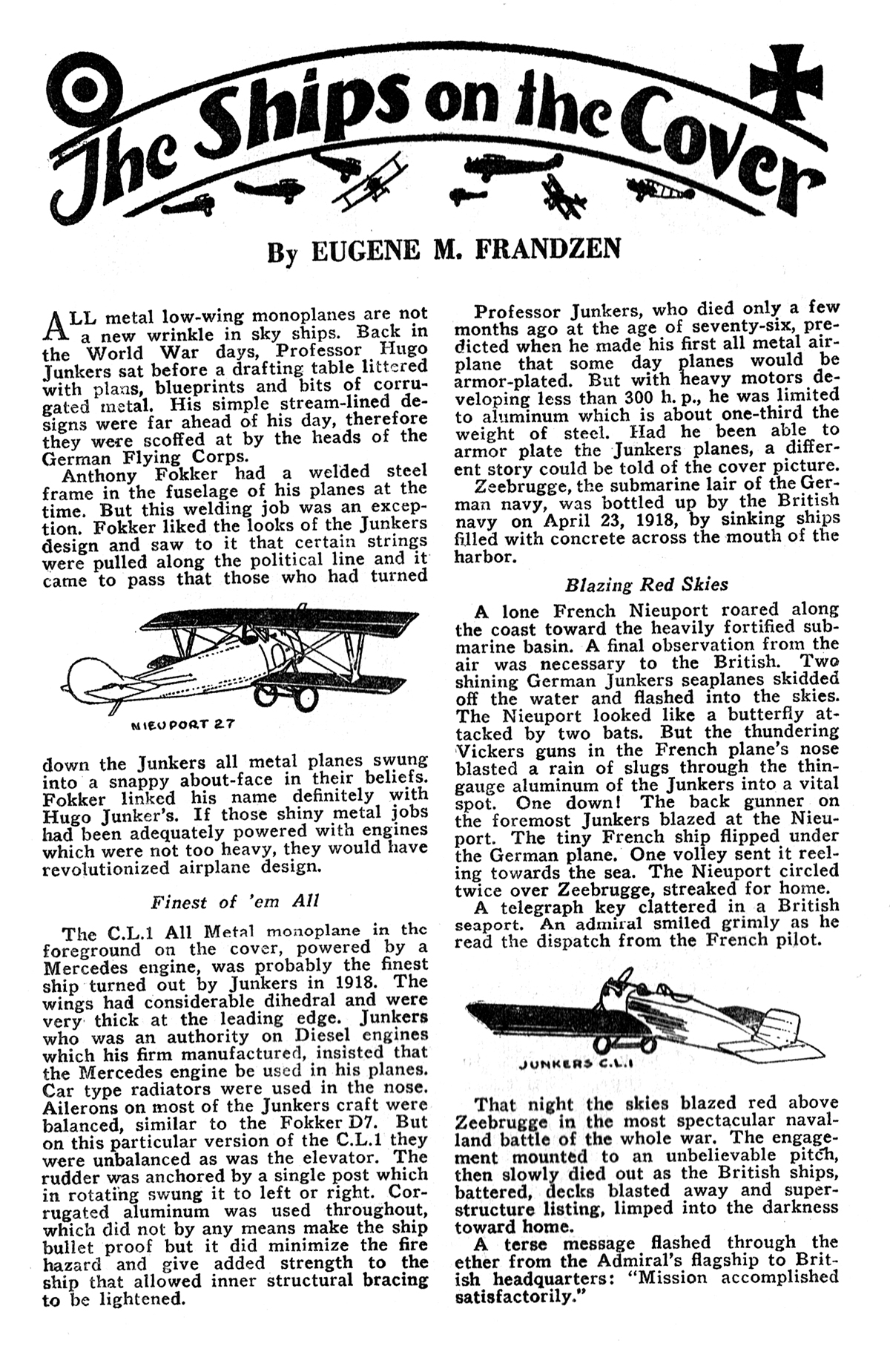 A lone French Nieuport roared along the coast toward the heavily fortified submarine basin. A final observation from the air was necessary to the British. Two shining German Junkers seaplanes skidded off the water and flashed into the skies. The Nieuport looked like a butterfly attacked by two bats. But the thundering Vickers guns in the French plane’s nose blasted a rain of slugs through the thin-gauge aluminum of the Junkers into a vital spot. One down! The back gunner on the foremost Junkers blazed at the Nieuport. The tiny French ship flipped under the German plane. One volley sent it reeling towards the sea. The Nieuport circled twice over Zeebrugge, streaked for home.