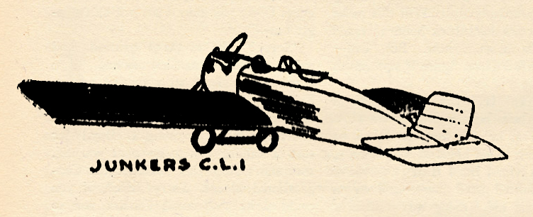 The C.L.1 All Metal monoplane in the foreground on the cover, powered by a Mercedes engine, was probably the finest ship turned out by Junkers in 1918. The wings had considerable dihedral and were very thick at the leading edge. Junkers who was an authority on Diesel engines which his firm manufactured, insisted that the Mercedes engine be used in his planes. Car type radiators were used in the nose. Ailerons on most of the Junkers craft were balanced, similar to the Fokker D7. But on this particular version of the C.L.1 they were unbalanced as was the elevator. The rudder was anchored by a single post which in rotating swung it to left or right. Corrugated aluminum was used throughout, which did not by any means make the ship bullet proof but it did minimize the fire hazard and give added strength to the ship that allowed inner structural bracing to be lightened.