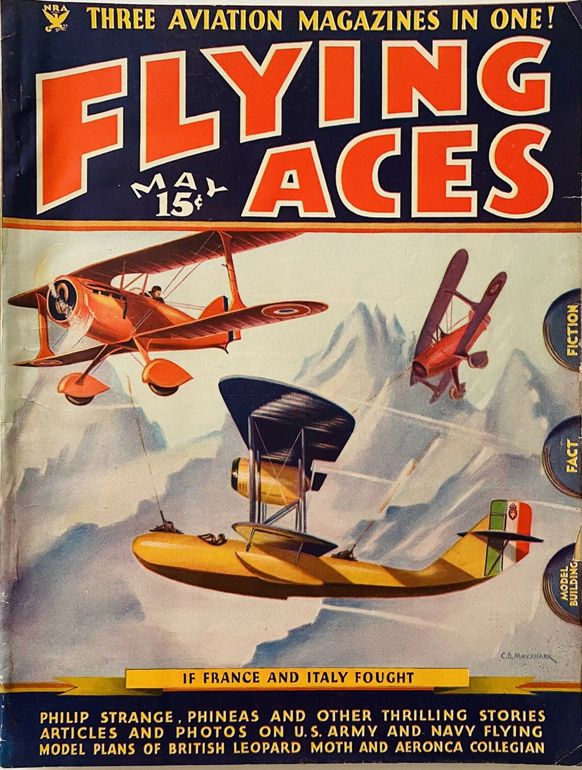 THIS May we are once again celebrating the genius that is C.B. Mayshark! Mayshark took over the covers duties on Flying Aces from Paul Bissell with the December 1934 issue and would continue to provide covers for the next year and a half until the June 1936 issue. While Bissell’s covers were frequently depictions of great moments in combat aviation from the Great War, Mayshark’s covers were often depictions of future aviation battles and planes, like May 1935’s thrilling story behind its cover which imagines what an aerial fight between France and Italy might look like!