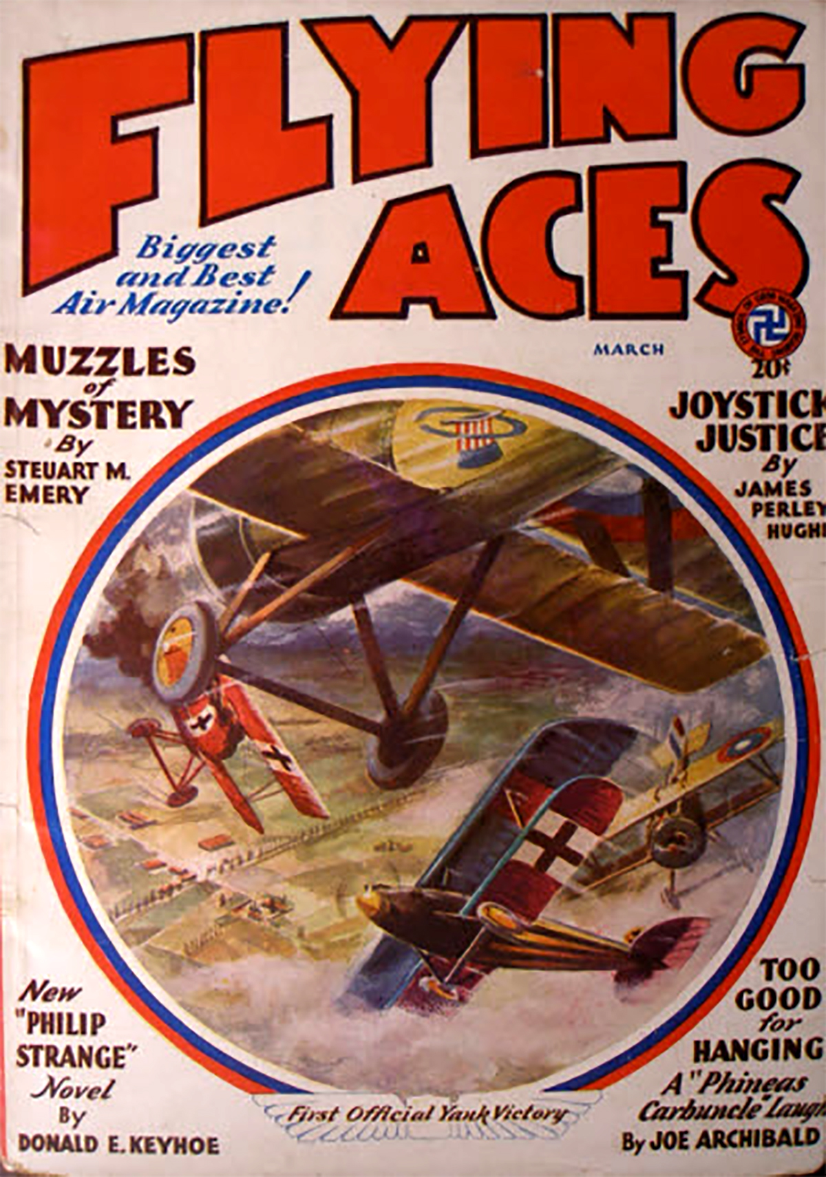 Phineas Pinkham meets his match when the 9th Pursuit’s latest replacement in the form of one Lieutenant Monk Flanagan, once known as Perfesser Merlin the Great of the Hipperdrome Vodyville Circuit, arrives. Poor Phineas gets a taste of his own medicine—he can certainly dish it up, but can he take it? Find out in Joe Archibald’s latest Phineas mirthquake, “Pride of the Pinkhams” from the May 1932 Flying Aces.