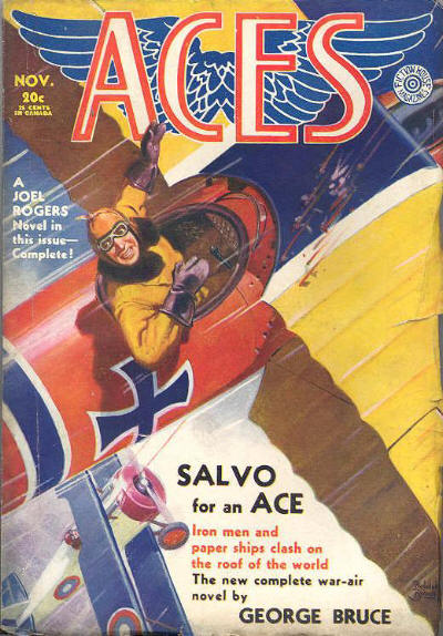 by Joel Townsley Rogers. Born in 1896 and studied at Harvard, Rogers saw The Great War as an adventure and joined the Navy Air Corp and became one of it’s first few hundred pilots. Unfortunately, the war ended before he saw action and ended up as a flight instructor at Pensacola instead. After the war, he turned his experiences into stories for the pulps. In addition to air stories, Rogers also wrote numerous mystery and science-fiction stories as well.