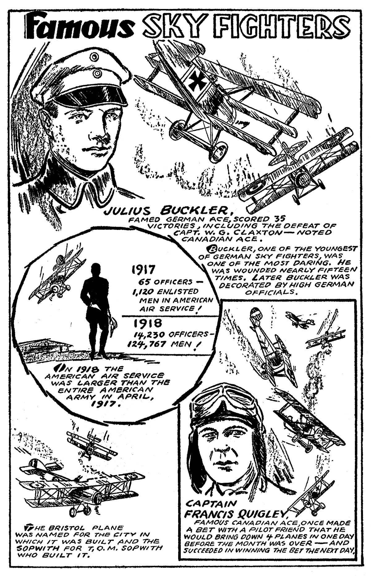 STARTING in the October 1933 issue of Sky Fighters and running almost 5 years, Terry Gilkison’s “Famous Sky Fighters†was a staple of the magazine. Each month Gilkison would illustrate in a two page spread different Aces that rose to fame during the Great War.