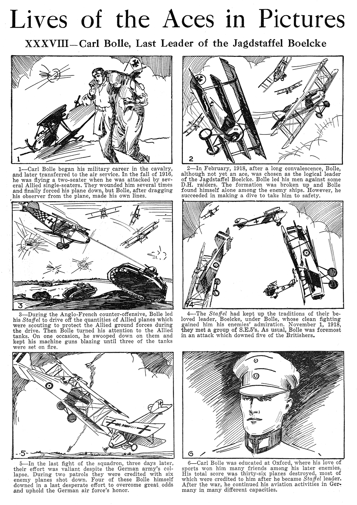 The February 1936 installment, from the pages of Sky Fighters, features Lt. Edward Roberts, Lt. Col. Robert Rockwell, Major Byford McCudden, and Rittmeister Carl Bolle!